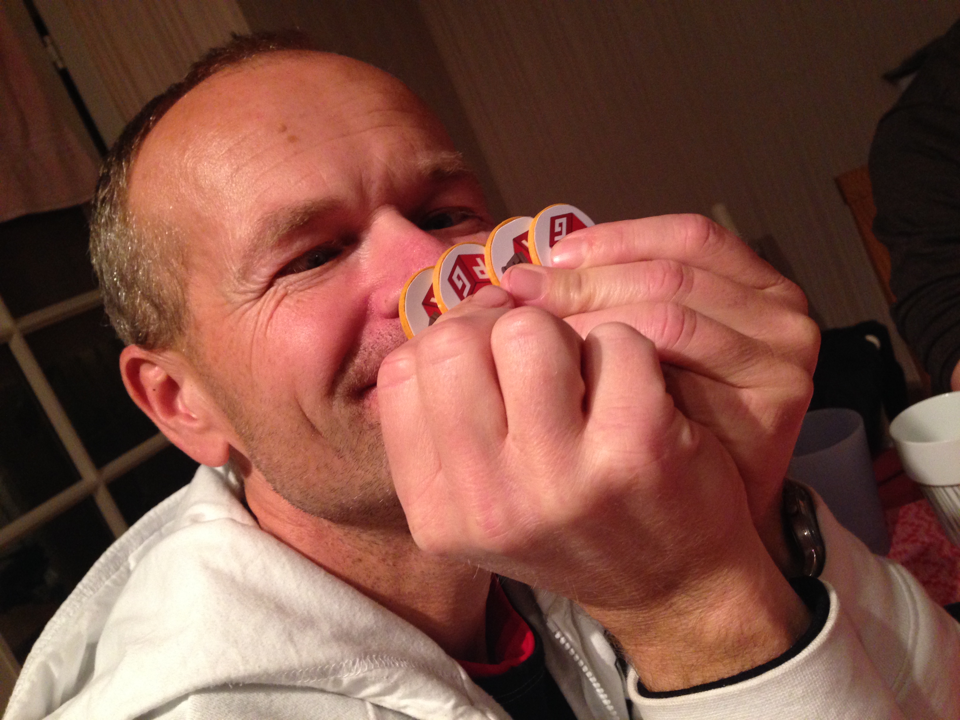 Skull & Roses. Spilt det før, men viste det for Trond som en filler med en del latter. Men det er ikke alltid like enkelt når noen ikke forstår spillet og kanskje med vilje prøver å sabotere? Nykommeren endte opp med å vinne og hadde allerede mistet 3 av sine 4 brikker. Dette er et enkelt bløffespill hvor du har 4 brikker. 3 roser og 1 hodeskalle. Du legger ut en og en brikke, inntil noen skal prøve å gjette hvor mange roser det er der ute. Så skal vinneren av budrunden velge ut en og en brikke og finne like mange som budet sitt. Finner man en hodeskalle før det, mister man en brikke resten av spillet. Lett. Men vanskelig. Og artig.