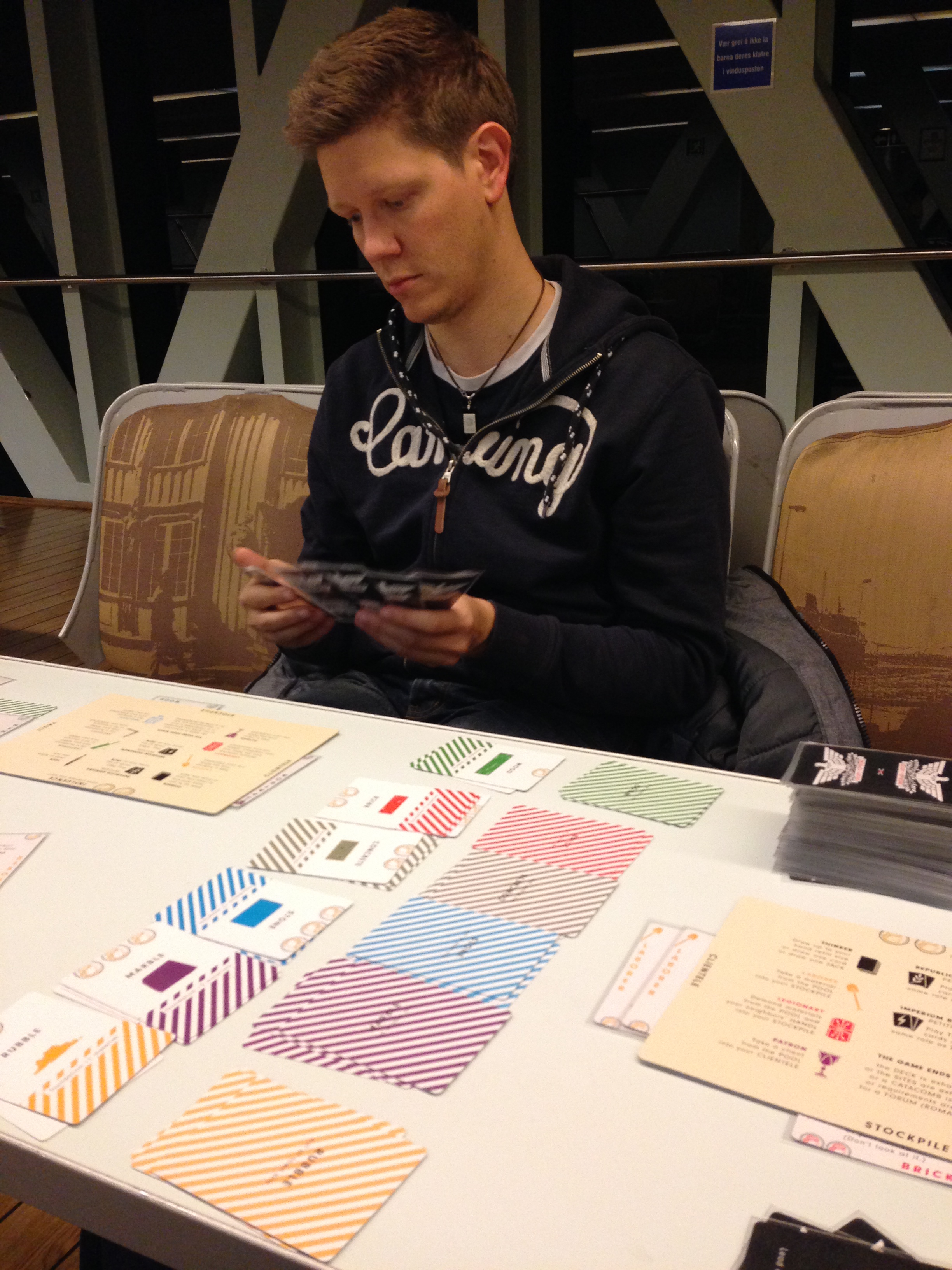 Mens barnespillene pågikk på fastlandet ble det spill for karer på ferja. Glory to Rome fant veien til det lange og smale bordet hvor utfordringen ville bli både tid og plass. Vi fikk en litt tregere oppstart enn vanlig og oppbyggingen tok noen ekstra runder. Takras følte ikke han fikk til noe og hadde ingen bygg ferdige mens både Skillz og Kim hadde ferdige 2 bygg. Dette begrenser antall klienter man kan ha som igjen setter deg akterut om du ikke passer på timingen. Men Skillz og Kim følte også at det ikke gikk helt dems vei, det var inntil Skillz begynte å stjele klienter fra sine to gode naboer. Da gikk det bare én vei: Skillz’. Kim prøvde å bruke Prison for å kapre dette kortet fra Skillz, men fikk ikke med seg at han mistet 3 poeng som han måtte gi til Skillz. Vi nærmet oss broa i Stavanger og Skillz valgte å avslutte spillet ved å bygge siste lilla bygg. Opptelling og bonuspoeng avslørte Skillz som vinner, med Takras ett poeng foran Kim – som sikkert tenker seg om neste gang han setter noen i fengsel.