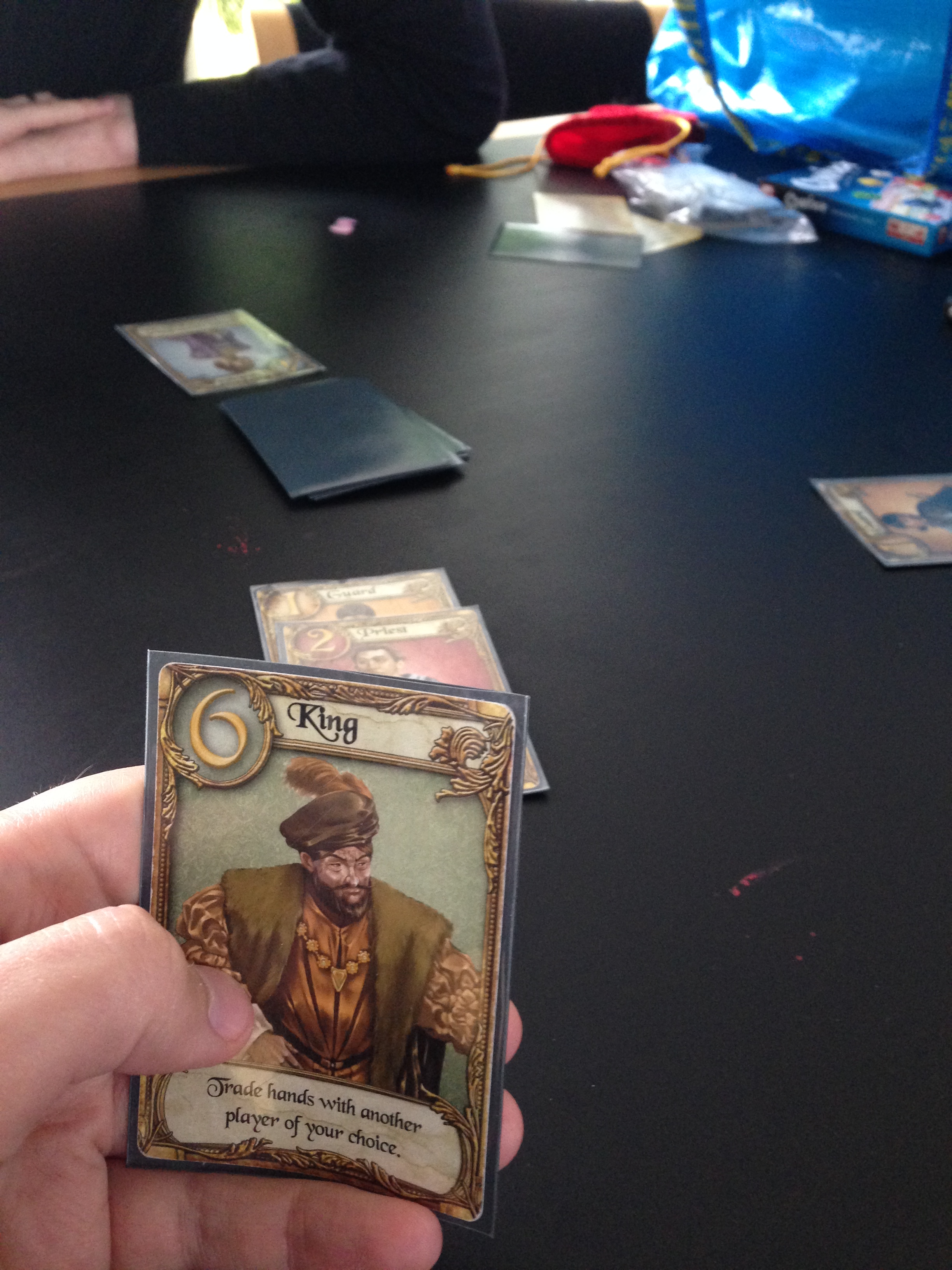 Et lite besøk til Sola brettspillklubb gir ofte nye impulser, denne gang i form av kjærlighetserklæringer. Neida, det er ingen romanse på gang spillerne seg imellom, men mot prinsessen i spillet Love Letter. Dette spillet har kun 16 kort og noen markører som holder telling på hvem som leder. Du har ett kort på hånd. På din tur trekker du et nytt kort og spiller ut ett av de du har og utfører teksten. En runde kan faktisk være ferdig før alle får spilt ut sitt. Alle kort har egenskaper avhengig av hva de er. Det finnes for eksempel bare 1 stk av Prinsesse, Konge, men hele 5 Vakter. Hvis du ender opp med å kaste prinsessekortet, så er du ute. Det er litt deduksjon oppe i det hele. Du må se på kort som allerede er spilt ut og hvem som spilte det ut. Du må følge med på om kort som trekkes er det samme som spilles ut. Men så er det samtidig veldig mye flaks som kan skape mange artige situasjoner. Vi spilte flere runder enn nødvendig for dette er et ganske så vanedannede spill som har veldig mye «én gang til»-faktor. Dessuten er det utrolig kjapt.