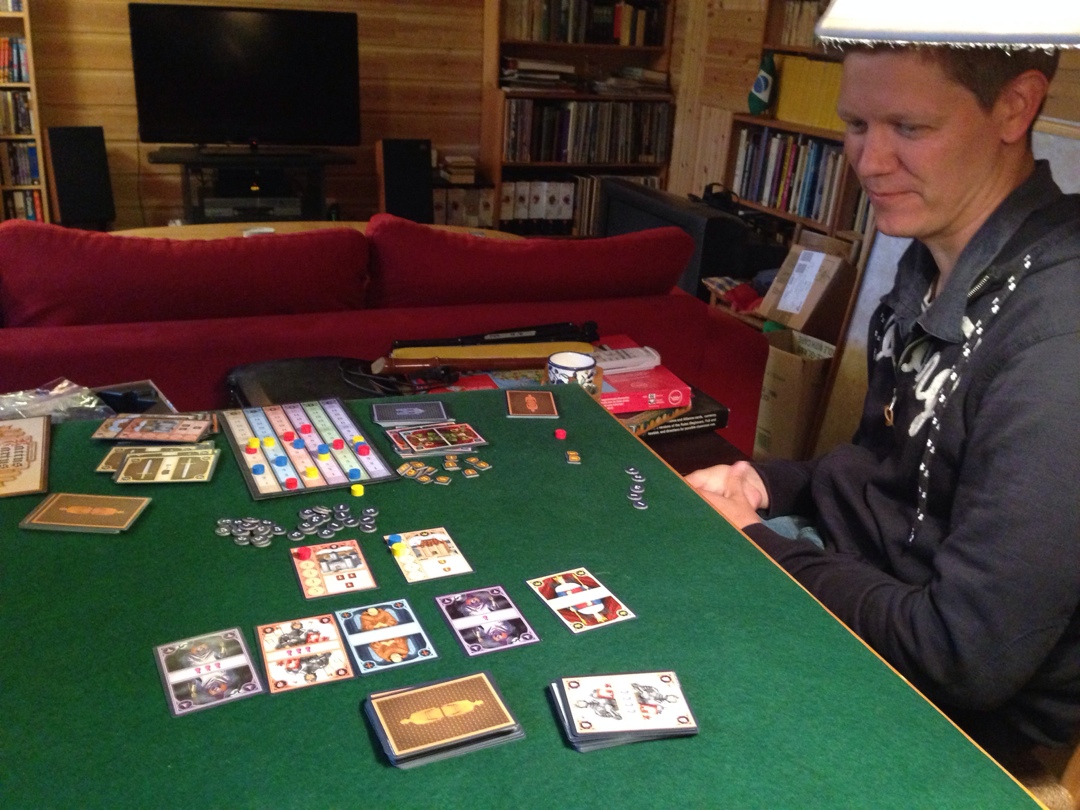 Så var det de 3 fasene. Valg gjør at en kan sette ut hus eller få seierspoeng for husene sine i byen. Landbrytningsfasen: Gir en tilgang til ressurser og økende seierspoeng underveis likt slutttellingen i St. Petersburg. Handel: Gir en muligheter til å handle skinn av indianerne og seile disse til Europa i bytte mot seierspoeng. Altså var det 3 veier til rom og helst litt av alle 3 av de. 6 runder spilles og det var harde auksjoner og valg underveis. Black ant satset på å være 3. mann i auksjonsfasen og spare mange penger på dette, mens Sveinmain satte første bud nesten hver gang.