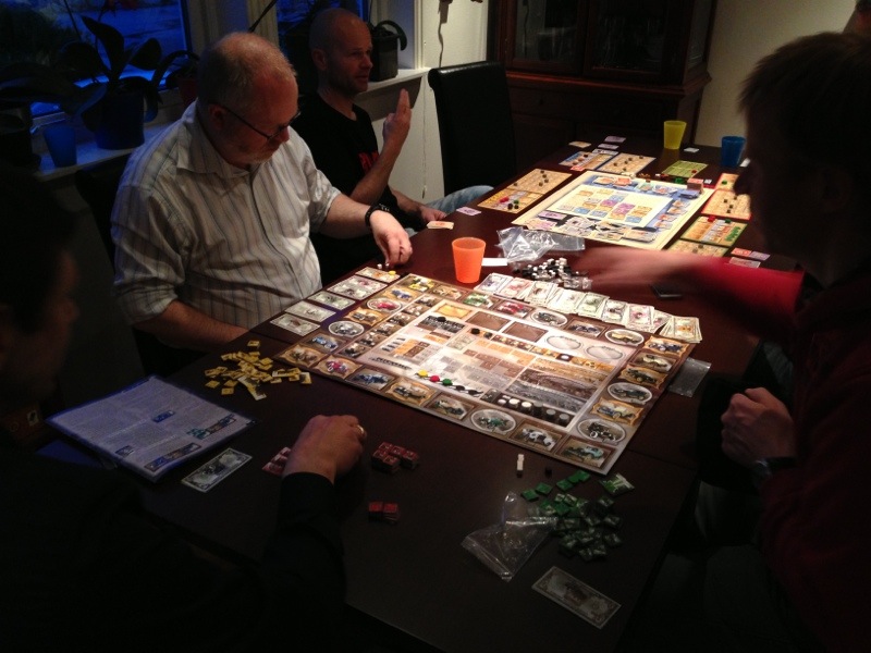 Ommøblering måtte til hos Ant for å få plass til alle spillene. Med 3 bord måtte 2 bord spille på samme bord og etter en runde på loftet var Sveinmain, Peter og Saulius klar for en ny runde Automobile. Med kun 3 spillere som skulle opprette bilfabrikker, produsere og ikke minst selge biler så var vi kjapt i gang. Peter tok ansvaret for banken, noe Sveinmain og Saulius var litt skeptisk til, og det tok vel kun 2 minutter før Peter hadde doblet kontantbeholdningen sin under første utbetaling. Banken ble flyttet umiddelbart langt unna Peters distre armer, og med Saulius som Sheriff i Fordland var det trygt å bruke penger igjen. Spillet gikk mye raksere unna med 3 enn sist vi spilet det med 5. Saulius og Peter som begge er gode tenkere hadde såpass tempo at Sveinmain ble den store sinkeren. Saulius overproduserte allerede i runde 2 da han ikke fikk med seg at det var konseptbilene som det ble produsert mest av den runden. Hans masseproduserte biler måtte bli til spiker. Så ble det en jevn 3.