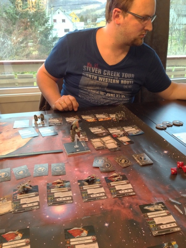 Yngstegutt fikk lov til å være litt ekstra oppe, men måtte omsider i seng, men da kom Oscar og slo seg til rette med Star Wars. Reglene forklares ganske greit i dette spillet. Det ble Oscar og Takras vs. Hollender som opprørerne. Det gikk ikke veldig godt for Hollender som etter kort tid mistet alt han hadde, han mistet også kontroll over spesialhandlingen sin pga kritisk skade. Første runde fikk litt lunken mottakelse hos Hollender, men det skulle raskt endre seg med å innføre et Scenario. Neste scenario ble det de samme lagene, men denne gangen hadde Hollender skjult seg blant asteroider og måtte reparere skade. Oscar og Takras skulle finne og eliminere trusselen. Hollender kunne ikke kjøre mer enn 1 og 2-er lengder (mot normalt 1-5) de 5 første rundene. Om han overlevde så lenge, så trengte han bare å stikke ut fra brettet. Oscar gjorde et par feilmanøvre og endte opp på utsiden av kartet med sitt første skip. Det ble erstattet av en vanlig TIE-fighter, men idet Hollender skulle stikke av, hadde Oscar snudd skipet sitt 180 grader og kunne ikke skyte. Hollender kjørte så avgårde og kunne fortelle om hemmelighetene han avdekket hos imperiet. Scenario gir spillet en helt ny dimensjon og anbefales så snart alle forstår grunnreglene.