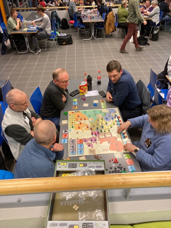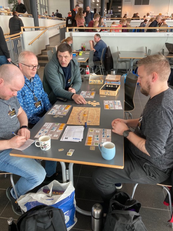 Tilbake i hovedsalen satt Peter, Kenneth og Kristian og ventet på å begynne på spille. Jeg og Saulius fant frem 5 mannsspillet RA – klassiker av Knizia. Kenneth og Kristian slet med å score poeng i dette råe auksjonsspillet. Peter scoret og scoret og vant hele greia. Skal du spille et auksjonsspill, så er det RA. 8/10.