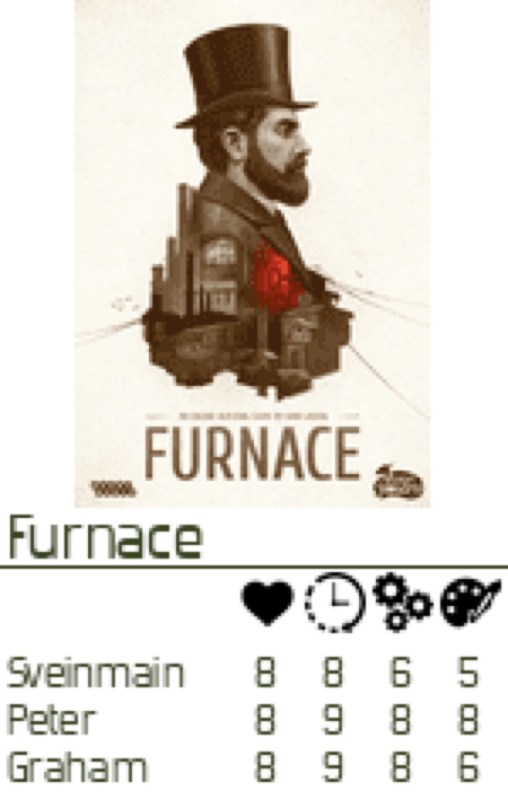 Furnace var et kjapt og kjekt spill, som fikk 8 av 10 på terningen av samtlige, selv om auksjonen var litt annerledes enn auksjonsspill forøvrig.