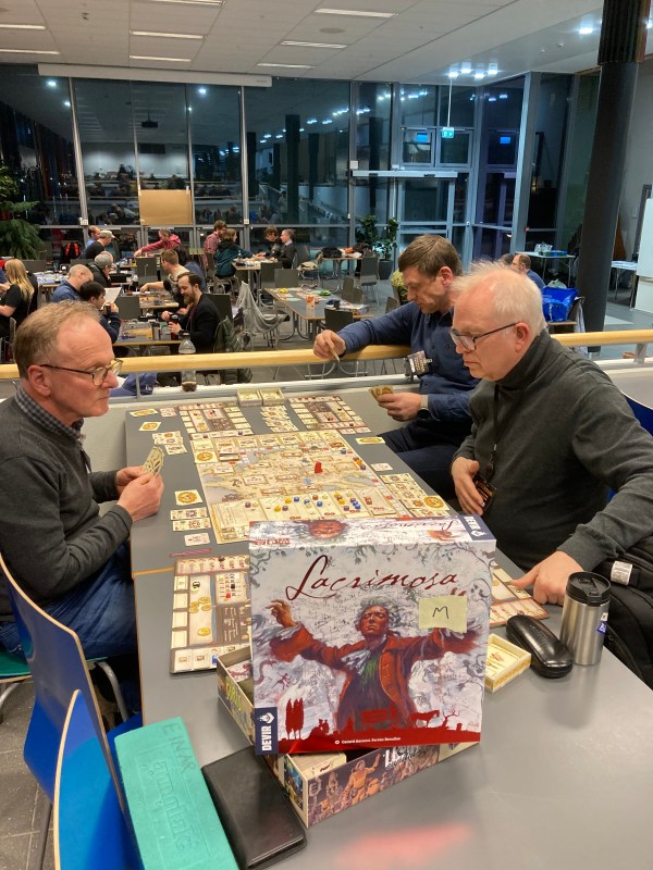 Fremme i Haugesund ble vi møtt av en hel resepsjon med folk, ledet av Nils. Alt gikk smood med smil og velkommenfølelsen vi alltid får der oppe. Nye fantastiske lokaler på Karmsund Vgs ble inspisert. Lufta i lokalet var frisk og rein tross for intens spilling allerede i 24 timer. Lyst og luftig – herligt og med gode spillbord! Hvem savner slaktehuset? Litt hilsing og smalltalk før vi satte i gang med det vi egentlig hadde kommet for – brettspilling. Peter som var tilstede allerede på torsdag hadde gått å trippet for å gjenforenes med gjengen, da Kåre = Kvalitetsspill dro frem godsakene. Kåre skuffer aldri, og hadde forberedt Lacrimosa, spillet om siste symfonien til Mozart.