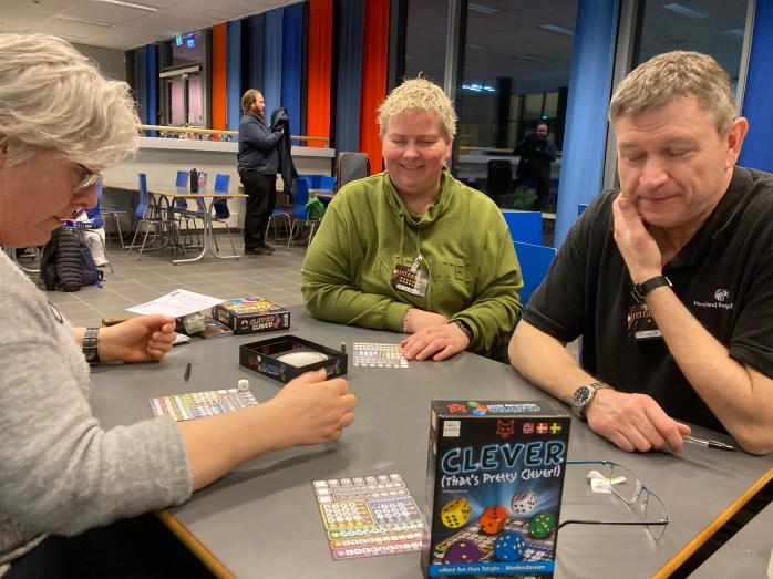 Britt og Terje var også Ganz Schön Cleverfans, og jeg trengte en ekstra runde, og gikk bare bort i GameNinjas popoppbutikk og kjøpte meg et eksemplar. Fantastisk med egen brettspillbutikk på MW. Britt og Terje lærte meg de triksene jeg ikke kunne og Gina ble også med. Igjen kjekt og angret ikke på kjøpet. 8/10.