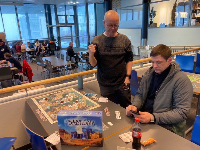 En dårlig natts søvn som vanlig når en er på brettspillfestival, men hva gjør vel det når en siktet seg inn på Pitchcarturnering kl. 10, men var på plass allerede kl. 9. Knut og Saulius var også på plass, og Sveinmain introduserte dem for Babylonia av Reiner Knizia. Legg ut 2 eller 3 brikker ut i fra enkle regler, og score poeng. Ikke vanskelig, men da Sveinmain scoret en haug med poeng og fikk tidenes forsprang på noe ingen så komme, var det allerede for sent for Knut og Saulius. De havnet i bakevja og ble liggende der. Blir nok hardere kamp neste gang. Men likte det godt og mye spill til kort spilletid. 8/10.