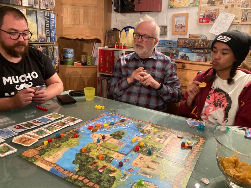 Hangaround Terje bruker alltid å bli med på MidWinter når PG tar turen opp. Så også dette året. Han ville spille noe skikkelig, og Sveinmain og Peter tok han med til Mombasa. Eneste minuset var at ingen av oss hadde spilt det på over 5 år. Reglene var mange og rustne, og det preget både spillingen og opplevelsen dessverre. Men Mombasa må nok komme kjappere på bordet igjen, da dette var vårt Alexander Phisterfavoritt før han lagde Great Western Trail, og siden ikke blitt spilt. 6/10 men har potensial til 9/10.