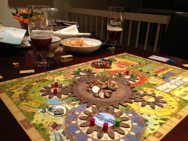 Black Ant hadde spilt dette en gang tidligere men ble virkelig overtrampet av Peters totale forståelse for dette spillet dengang. Takras er ennå en ubeseiret ikke-vinner i dette spillet, så da var endelig anledningen tilstede for en seier? Kjapp gjennomgang av reglene, og vi var i gang. Begynnelsen var litt treg som forventet, for her er det mye å forholde seg til. Men en hjemmebrygget juleøl setter god stemning til tross, samt litt godsnakking rundt bordet. Takras satset sterkt på gudene denne gangen, og fikk maksimal favør for både den brune og den grønne guden. Black Ant stilte seg tidlig opp i Chichen-hjulet da han hadde startet spillet med en ekstra arbeider og en hodeskalle. Han ventet helt til siste liten med å sette den ut, slik at han fikk maks uttelling for dette. To ganger brente han skogen for å få mat og ergret gudene med sin lite miljøvennlige plan.