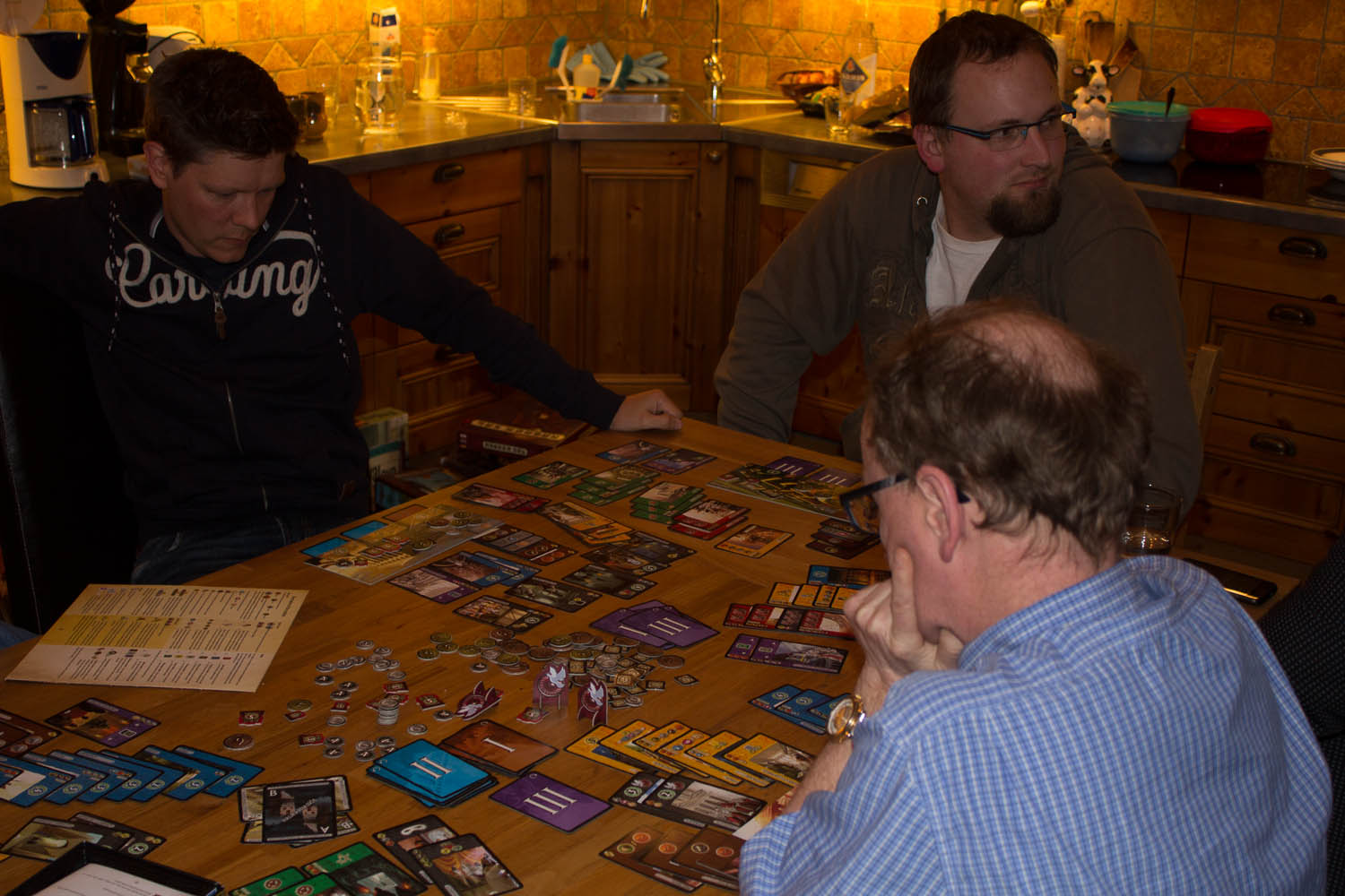 Skillz, Vegard og Takras var ferske her, og Kaoleena forklarte reglene systematisk. Det er mye som må fordøyes her, men det meste ble godt forklart, og det ble fortalt at det ikke var noen special final scoring, annet enn det som stod på våre handouts. Og hvilke handouts det var! Skillz mestret det meste helt fra starten av, og sikret seg startspillerposisjonen i de fleste rundene, og dermed mange jokere han kunne bruke. Resten måtte belage seg på gudekort og «vanlige» handlinger. Skillz skrek høyest i begynnelsen av spillet da Takras hadde fått 13 poeng etter første runde. 13 poeng! Men som vi kjenner gode gamle Underdog (forslag til Skillz nye navn?), så raste han avgårde hele veien, og aktiverte sine menn som ga masse poeng hver runde. Men sluttellingen var i Kaoleenas favør, som sanket inn for både antall bygg ute på øyene og ressurser på hjemstedet sitt. Men så kom en special final scoring likevel! Mot å normalt å kunne fullføre bare én oppgave, kunne man i siste runde aktivere hele 3 til! Vegard hadde dette i boks, og var eneste som tjente på denne nye regelen. Takras lå langt bak, men kom akkurat over 100 poeng.