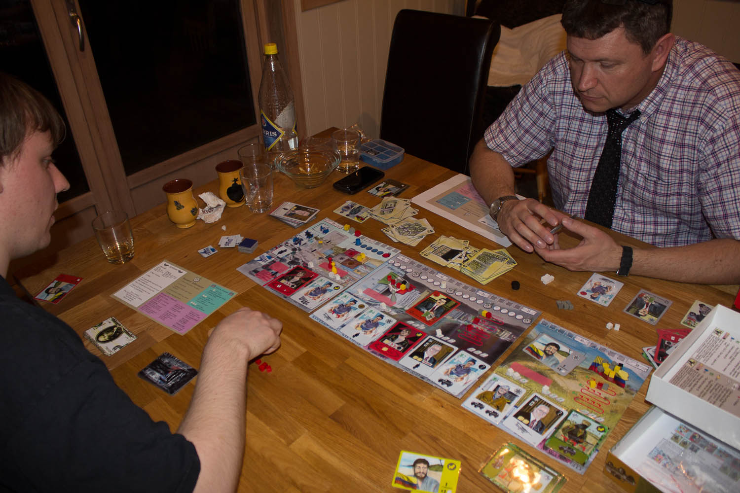 Som en avslutter skulle vi prøve Trans Europa Vaxation. Trans Europa er allerede en klassiker, men med 3 egne skinner hvor den andre må bygge rundt, hvordan blir det. Peter vant 1. runde og Sveinmain vant 2. runde og begge lå likt. Derfor kjørte vi en 3. for å avgjøre det hele. Skulle Peter få sin 1. seier i kveld? Ja, han hadde trengt det, men fikk det desverre ikke. 4-0 ble sluttresultatet, og Vexation gav spillet mer dybde, men ikke slik at det varte særlig lengre med 2 spillere i allefall, og har du Europautgaven trenger du ikke kjøpe denne…