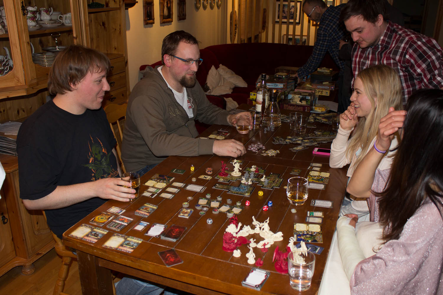 Marog og Takras hadde bestemt seg for at i kveld! I kveld skal vi spille Descent eller Mage Knight! Vegard var ennå på vei, og Bora Bora fant plass på det andre bordet. Da ble det bestemt å spille Mage Knight The Board Game, og det var pakket ut til Vegard kom. Vi hadde alle spilt det før og valgte derfor å bare sette i gang, med samarbeidsoppdrag om å ta tre storbyer før det var gått to døgn. Takras brukte mange ressurser på å få seg med Influence og fikk mange kort i stokken sin. Marog samlet på krystaller til alt det var verd, og sjeldent har vi sett så mange krystaller samtidig hos en spiller. Vegard kunne samle på sår, men som alle denne kvelden var vi veldig pysete i kamp, og fikk dermed lite med wounds – men også lite med nye fordeler. Vi slet hardt mot tiden, og fant endelig den første byen på dag 2. Men motstanden var altfor hard. By nummer 2 fant vi rett før natta, og valgte å bruke alt vi hadde for å beseire den. Vegard gadd ikke vente en liten tur til, og Takras ble ikke med i siste kamp mot byen. Vegard knuste opposisjonen som om det var varm kniv i smør, mens Marog var sjanseløs. Han måtte ofre mye, og klarte ikke vinne over sine motstandere. Enden av visa ble at vi klarte å ta én av tre byer. Vi hadde et døgn for lite, men det burde la seg gjøre om vi ofrer litt mer på veien. Vi valgte å hoppe over mange steder i frykt for litt wounds. Men spillet: konge! Og ja, vi ble ferdig etter klokken 23, til Hollenders store overraskelse.