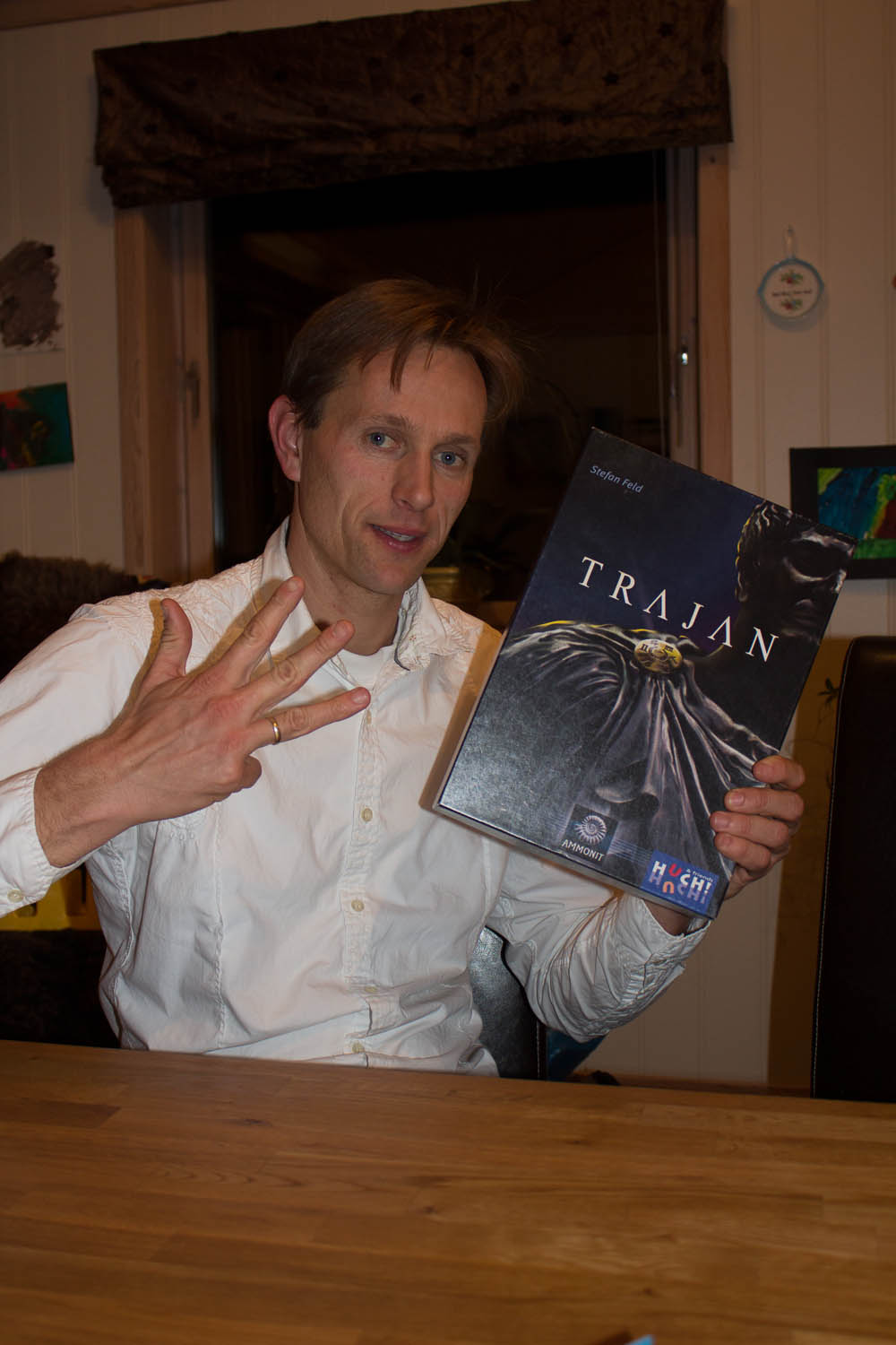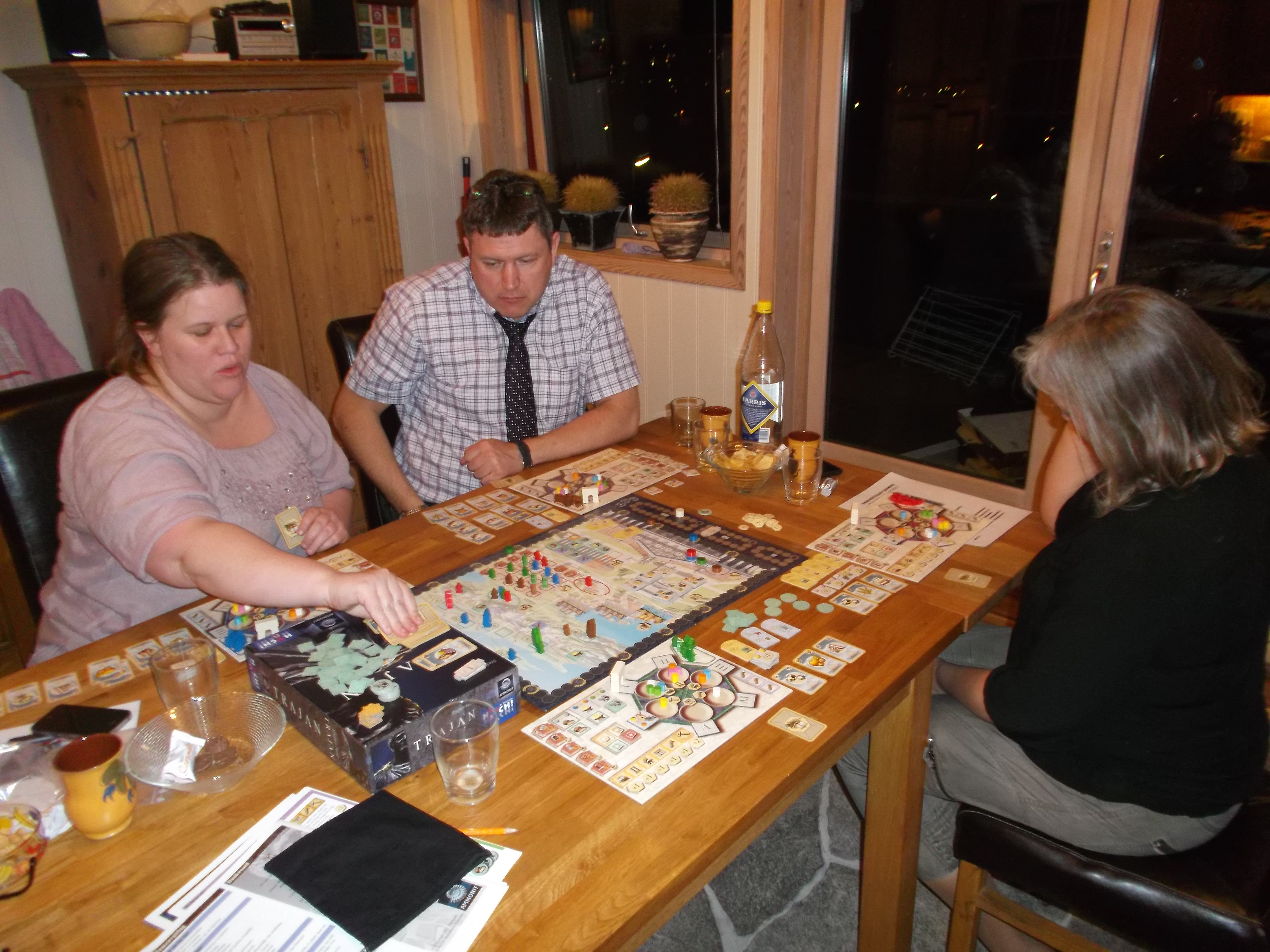Så var det tilbake til det andre bordet: Artefact og Hanne hadde ikke spilt Trajan før, slik at Hollender tok det fram. Før alle hadde satt tok Kaoleena en olympisk spurt og sikret så den fjerde stolen ved Trajan-bordet. Hollender serverte reglene og Kaoleena ,som hadde spilt dette dagen før online, assisterte. Artefact skjønte at dette spillet krever litt trening og tok på seg en underdogrolle (hvor har vi sett det før?). Da alle
