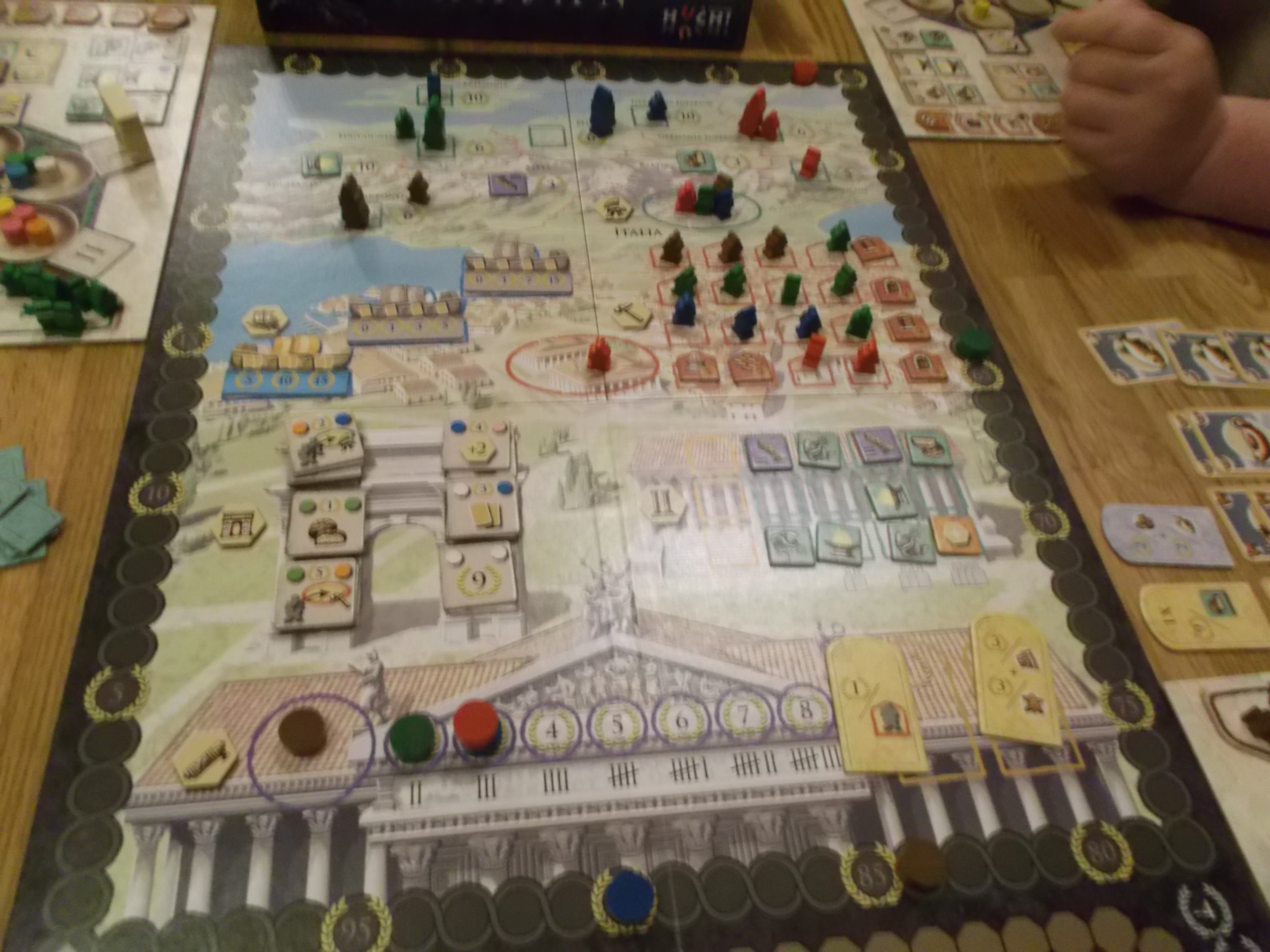 reglene var forklart kom spillet rask i gang. Hollender tok som forventet en rask og god ledelse, men da folket kom med sine krav (behov) mistet Hollender hele 15 poeng og dette gav de andre litt mer håp. Nå var det Kaoleena som hadde sikret seg flere skipshandlinger som suste av gårde. På slutten av runde II ledet hun med nesten 30 poeng. Hanne og Hollender hadde stoppet opp, men klarte nå folkets behov og sikret seg noen viktige bonusbrikker. Einar var den første som klarte å komme nærmere Kaoleena. Han fikk ut den ene etter den andre Trajanbrikken og overtok ledelsen i runde III. Kaoleena klarte ikke å få nok stemmer i senatet og gikk igjen glipp av bonusbrikkene. Likevel hadde han tatt ledelsen tilbake. Hanne hadde endelig fått litt sving på motoren og fikk flere ekstra handlinger. Hollender erobret nå halve byen og klarte å få 2×3 like bygg og 1×4 like bygg. Artefact følte at det stadig