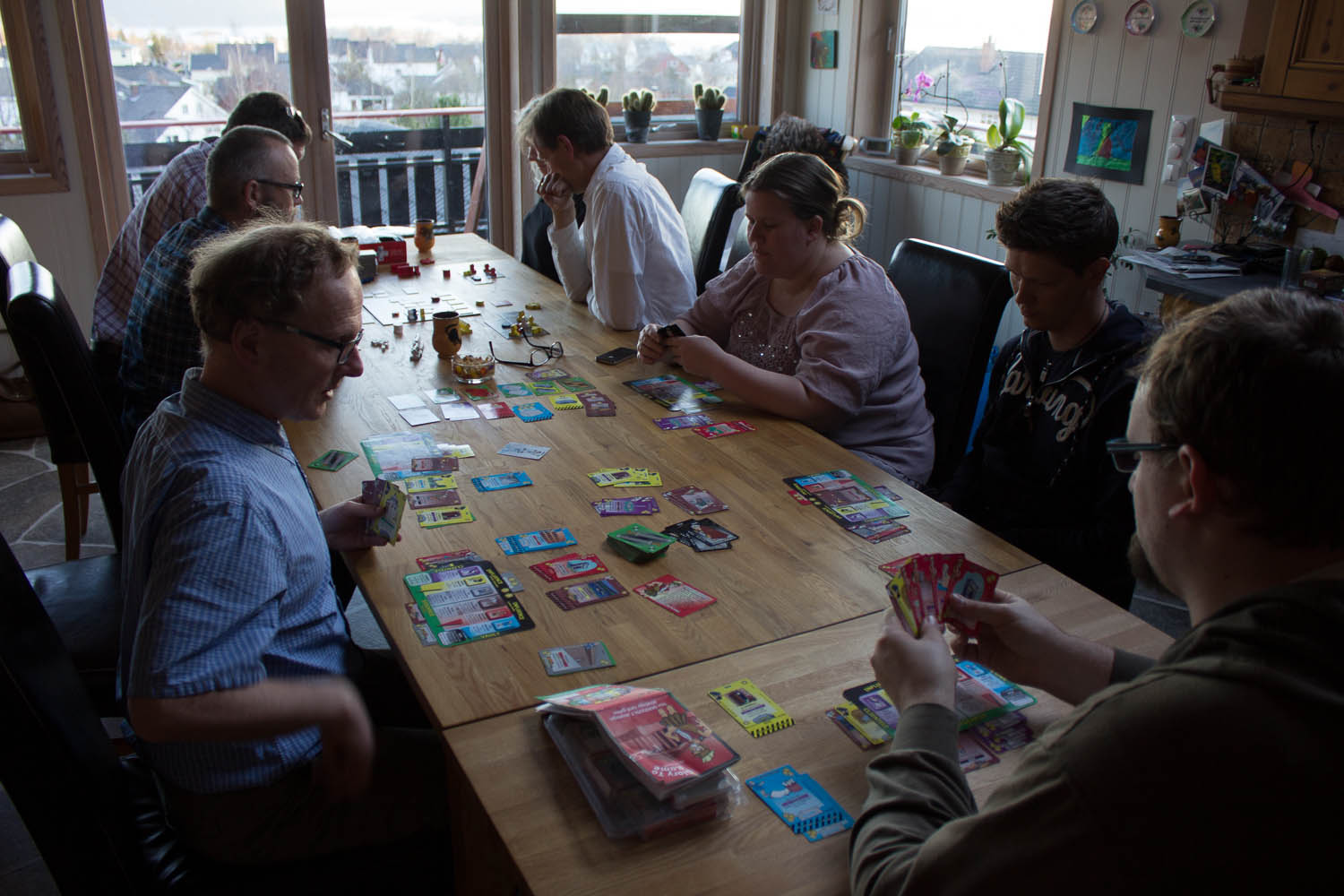 Så var det tid for Sewer Pirats igjen! Denne gangen med bare voksne (aldersmessig, i hvertfall 🙂 ) kapteiner. Regelen om å bli kaptein er tydeligvis litt vanskelig for Takras å forklare, og måtte forklares flere ganger underveis. Rotta og røyskatten uteble, og vi valgte å ikke gå for auksjonsfasen denne gangen heller. Det er nok best om alle har spilt det fra før. Sveinmain slet med å lage planer, for før han visste ordet av det, hadde noen tatt rotta på et av skipene han hadde siktet seg ut og seilte avgårde uten ham. Så det ble en hard kamp om kapteinene. Takras satset ikke på mange kapteiner, men heller de «trygge» boksåpnere med boks som kombinasjon. Ellers mange pommes frites og hamburgere, men ingen ketchup eller milkshake. Vegard hadde det verst av alle, og hadde ikke gitt sitt mannskap det de ville ha. Saulius lå likt med Takras, og vinneren ble Sveinmain, til hans store forbauselse. Dette var klart et mer opplevelsesrikt spill med yngre tilstede og hvor tempoet er større, men det var et fint spill også for voksne som liker å snike litt i køen.