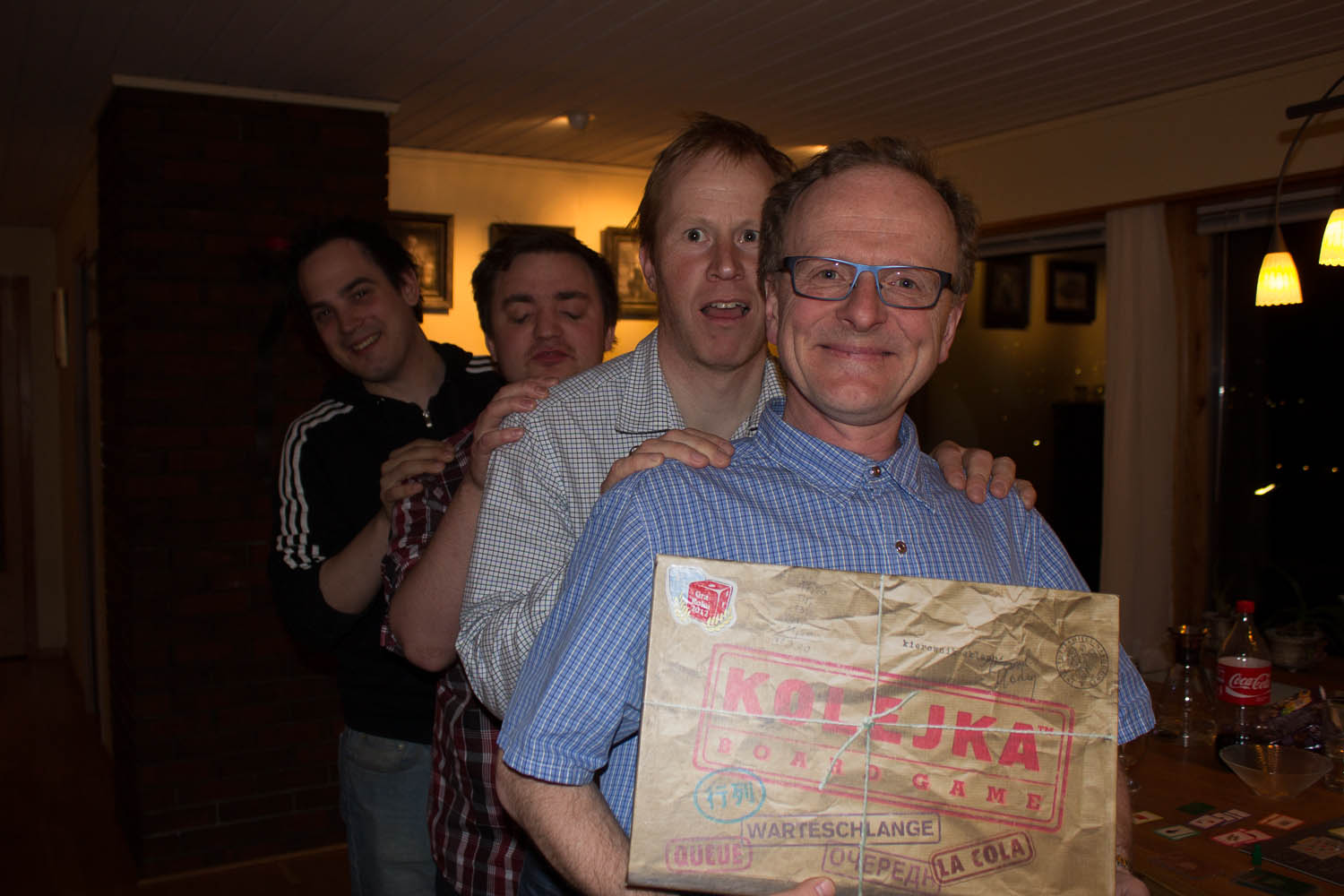 Sveinmain hadde fått ønsket sitt oppfylt for kvelden, og Nappeto hadde et annet: Kolejka. Hva kan være mer morsomt en tema fra Polen på 80 tallet da alle hadde penger og ingen hadde mat og utstyr. Butikkene var tomme, men kanskje det ville komme litt varer i en av de snart. Dermed var det bare å stille seg i kø, og det gjorde i tillegg til de overnevnte, Tom Erik og Pift. Etter at alle hadde stilt seg i kø i de 5 ulike butikkene med 5 mann hver så kom lastebilene med varer, men kun til 2 butikker. Lykkelige var de som hadde stilt seg i riktig kø, helt til kø-hoppingen startet. Plutselig flyttet varene seg, køen ble snudd oppned, og når du endelig hadde karret deg først i køa, så stengte noen hele butikken den dagen. Fantastisk stemning ble det rundt bordet og alle prøvde å fullføre handlelistene sine. Pift lå litt etter, men da dopapirbutikken endelig åpnet, kunne han hente hele 3 varer i den køa og dermed var det kamp igjen. Men så begynte vareleveransen å ta slutt. Panikken begynte å bre seg da kun 2 av 5 lastebiler hadde varer igjen. Nappeto tok en tur til det svarte markedet, og gjorde 2 bytter på rad og dermed kunne han svett men lykkelig heve armene overhode som vinner, og dra hjem og gi barna dopapir i stedet for granbar, mens vi andre var nære, men måtte ut igjen neste dag å stå i en ny kø, og kanksje, kanskje dukker det opp noe godt til oss neste gang.