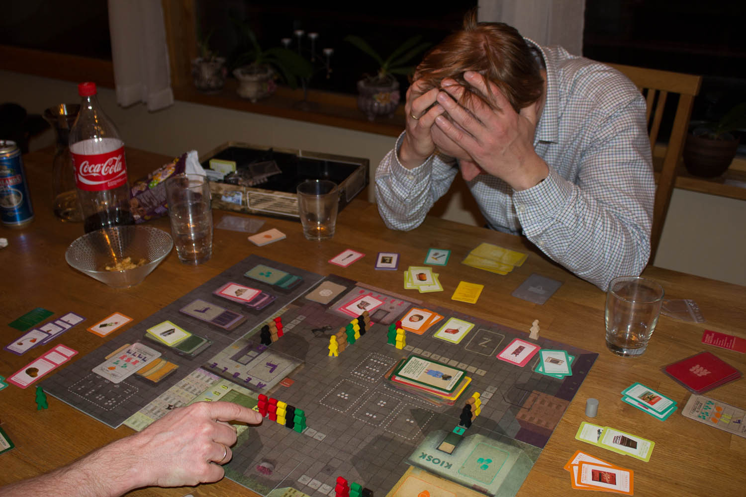 Godt i gang med Blitz-scenariet, så vi skulle få litt fortgang i sakene. 2 dager og 2 netter, og spillet var over. Men veien dit viste seg å være lengre enn vi regnet med. Plutselig var klokken 23, og vi var ikke halvveis engang. Men tiden fløy avgårde, selv om ventetiden mellom hver tur viste seg å være av drastisk karakter. Kim brukte litt tid på å se forskjellene på basic og advanced del av kortene, men der har vi alle vært i dette spillet. Forvirringen blir komplett når du får mana krystaller, manasteiner og mana fra poolen og det plutselig dukker opp et kort til som gjør tilsvarende, men denne gangen IKKE trill en terning.