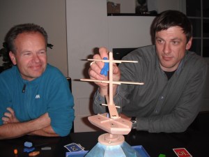 Targi var snart ferdig da Sveinmain tok opp Riff Raff, PGs hyggeligste nykommer av et spill. Og med 3 spillere gikk det raskt. Regler forklart på 10 sekunder og dermed bars det på bøljan det blå. Balansespill har alle prøvd før, men det er taktikken i dette spillet som gjør det unikt. Skal jeg spille høyt kort og satse på å legge på tidlig før det raser, eller legge lavt kort og satser på at andre velter skuta i mellomtiden. Mange harde valg og mye, mye moro. Såpass moro at jeg ikke husker hvem som vant og tapte, og det er sjelden.