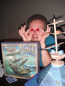 som liker det minst. Derfor var skepsisen stor da skipet i Riff Raffen ble bygd og komponentene kom frem – like speptisk. Men så begynte plasseringa, og Ant prøvde litt uengasjert å spille et av sine 10 kort bare ved å trekke det fra bunken, og det gikk fint, likedan neste gang – fortsatt lite taktisk inspirert spilling, men så, med 6 komponenter ombord på en snart veltende båt, våknet plutselig konkurranseinstinktet. Det var jo taktikk i spillet! Kjekt! Dermed ble det mye taktisk legging og Sveinmain måtte sope inn store mengder med brikker som raste av spillet. Saulius hadde store fordeler med sine store hender og fanget nesten alt som datt av, men også han fikk problemer da båten plutselig slår kontra og alt raser av på motsatt side til stor latter! Og mye latter ble det i Riff Raff, et spill som skaper fantastisk stemning og