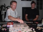 Før PG kom ordentlig i gang i kveld, tok Skillz en tidligere ferje for å ta en kjapp forrett med Takras. Valget falt fort på Targi, et rett han hadde hørt mye godt om. Reglene ble forklart og det var lett å komme i gang. Men første valg er selvsagt ikke bare-bare, med så mange valg og ikke lett å velge strategi. Takras er jo nå en erfaren Targispiller og gjorde raske valg – i begynnelsen. Etter hvert ble det mer og mer tenketid, og tiden nærmet seg 20:00. Et kvarter før tiden stakk Sveinmain, Pift og Peter hodet inn, og de fant seg noe annet mens de ventet. Vi hadde da bare to runder igjen. Det var tydelig å se at Takras hadde satset på å legge ned kort så ofte som mulig, mens Skillz var mer sparsommelig og satset kun på «de gode» kortene. Han fikk mange poeng underveis, og gull ble brukt som ekstra markører for å vise poengene. Og når det var tomt for gull, brukte vi chips for å vise hvor mye gull vi hadde. Artig. Skillz hadde mange flere poengmarkører enn Takras, men bonusene på kortene til Takras var for mye for Skillz å matche, og det ble en klar seier til Takras.