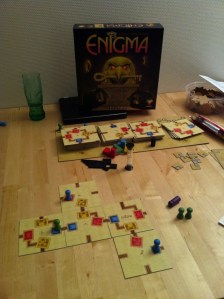 Sveinmain kombinerte transport av barn med litt spilling da han tok turen innom Takras sin arena med nyheter i baggen, ennå ukjent for PG. Opp av sekken tryllet han siste spill i big box serien til Competo; Enigma. Reglene var lest og etter litt punching av brikker var vi i gang. I Enigma skalen velge mellom 4 ulike oppdrag. Tangaram(bygg mosaikk innenfor et angitt felt), ubongo 3D sett ovenfra, En fiffi vektstangoppgave og å sette sammen et 9 felts aquadukt. Når du har klart oppgave du valgte er det også litt taktikk i å plassere brikken du klarte på brettet for optimalisering av poeng. Altså 4 pusleoppgaver samlet i en eske. Kreativt og samle 4 ulike oppgave enheter og i tillegg taktisk tenking i valg av oppgave da en også må prøve å score poeng på brettet. Takras var de flinkesteo ppgaveløseren denne kvelden, men snublet i det han skulle knuse Sveinmain. Dermed ble det tap på Takras denne gangen. 1. Sveinmain 15 poeng. 2. Takras 12 poeng