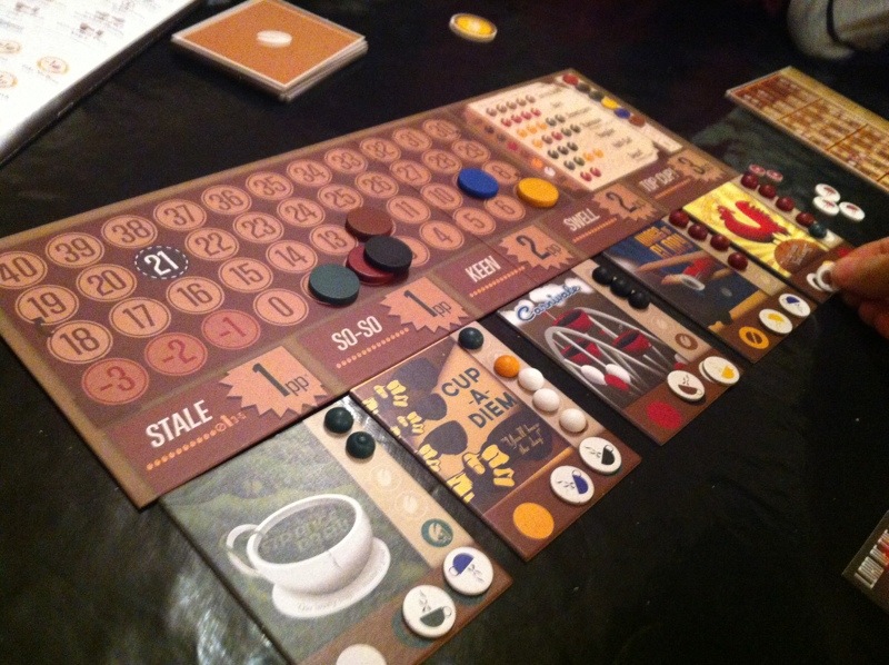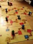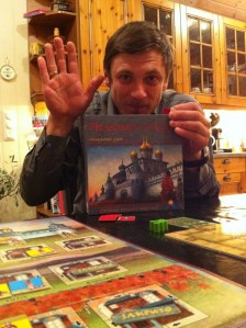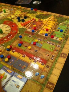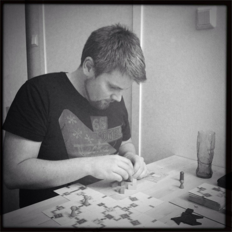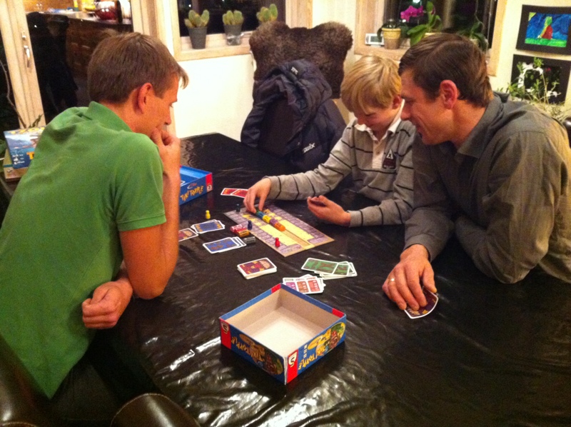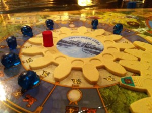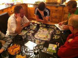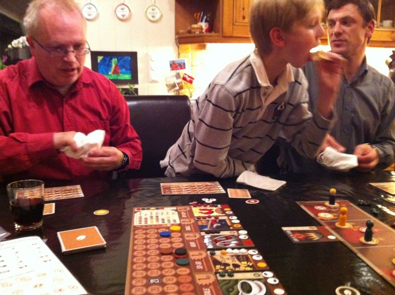 Kaoleena ropte høyt etter Tzolk’in: The Mayan Calendar. Dette spillet så så utrolig fint ut at hun bare måtte være med på det. Pift og Peter ble med på det, og reglene ble forklart – enda bedre denne gangen, nå som Takras hadde fått satt seg ordentlig inn i reglene. Det er mye å ta til seg, men alt gir mening og det er lett å finne flyten i spillet. Problemet er bare prioritering, men det er jo nettopp det spillet handler om. Peter la seg en skikkelig fin strategi på mat, og hadde aldri problemer med dette. Pift samlet på materialer, og fikk bygget masse underveis. Men han gikk i negative poeng på grunn av mangelfull mating av sine arbeidere. Kaoleena holdt seg akkurat innenfor matingen, men slet med å få poeng. Hodeskaller var det hun satset på. Takras prøvde å etterligne Peter etter hvert, men hadde samtidig fin kontroll på maten med 5 av 6 arbeidere som ikke trengte mat lengre. Pift ergret seg sterkt etter hvert på tiden Peter brukte på sine trekk, og mye frem og tilbake. Det er ikke uten grunn til at Peter mottok Analyse Paralyse-prisen. På slutten var det ingen som fulgte med, da Peter gjorde sine trekk under Pifts tur. Det var noen skeptisisme til om Peter virkelig hadde husket å mate sine arbeidere eller ikke, noe som ville ført ham tilbake 12 poeng! 1. Peter 48, 2. Takras 38, 3. Pift 36, 4. Kaoleena 29.