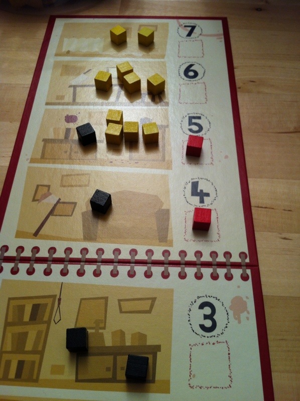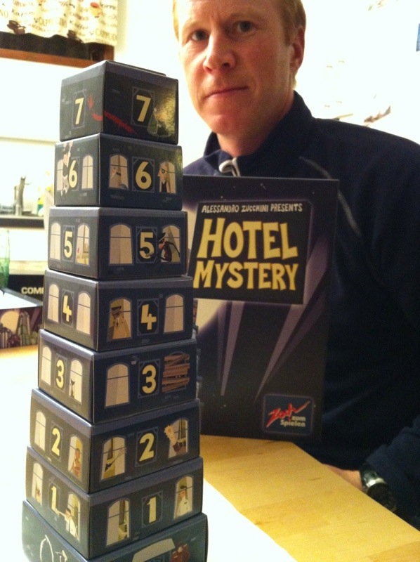 Det var litt tid igjen før sjåføren ble påkallet, så vi tok frem litt mord og mysterier i Hotel Mystery. Dette er et lyttespill, og spillet er et stilig lite tårn bestående av 7 etasjer. Hver etasje har en plate på toppen med et hull i midten. Disse blir så stablet på toppen av hverandre. Gjennom hele hotellet er det åpning i midten. Vi slipper kuber fra toppen, og må lytte. Hvilken etasje stoppet kuben på? Tror du at Sveinmains kube er i 5. etg? Da sier du for eksempel «Jeg så deg tydelig stikke av fra mordet i 5. etg», løfter av lokket, og ser om hans kuber er der. Var de der? Brilliant! Da setter du dem på en brett som gir minuspoeng. Jo fler du har, jo verre. Har du på samme etasje som selve mordet var på, er det ekstra minus. Sveinmains ører og øyne var skarpe i kveld, og både så og hørte hvor Takras hadde sine kuber. Han fikk også renvasket en del av sine, men tok også feil, heldigvis for Takras. Dette var et artig spill med høyt tempo, og stadig lettere å finne kuber. Men du må bare finne de riktige fargene du annonserer. Ser for oss at dette blir mer spennende med 4 spillere, så dette blir klart med på hytteturen med familien som Sveinmain skal med på.