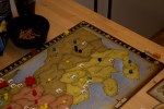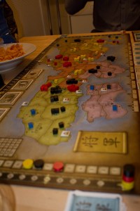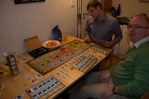 Nappeto foreslo å spille Hansa Teutonica, og Kim og Knut var klar til testing, Sveinmain sjekket kjapt alternativene på de andre bordene, før han litt motvillig satte seg ved Hansa Teutonica bordet. Hans siste gjennomspilling bar preg av en kaotisk hjerne uten å få tak på reglene i det hele tatt. Nappeto forklarte reglene samtidig som vi skulle spille på utvidelsen – Eastern Expantion som den heter. Brettet er derved litt annerledes, selv om systemet var det samme. D