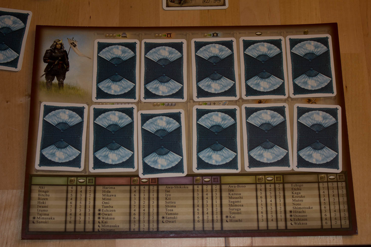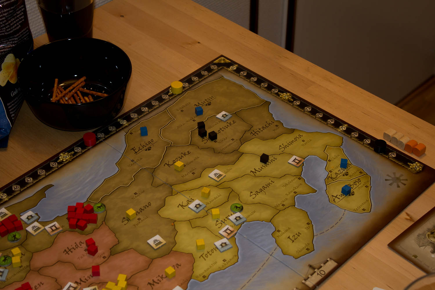 Påske nærmer seg med stormskritt, og mange har allerede tjuvstartet med ferien, så også i PG! Men Peter og Saulius dukker likevel opp når Takras inviterer til spilling denne kvelden. Det er alltid noen spillhungrige som sitter på jobb også disse dagene. På bordet fant vi to nye titler, nemlig Shogun og The Adventurers: The Pyramid of Horus. Valget falt meget kjapt på Shogun, og det ble pakket opp. Takras hadde lest gjennom reglene en kjapp gang før oppsett, og hadde bare hukommelsen etter en trøtt sesjon å gå på ellers. Så dette ble en trial-and-error runde. Heldigvis er det nok runder i spillet til å innhente eventuelle feilgrep.