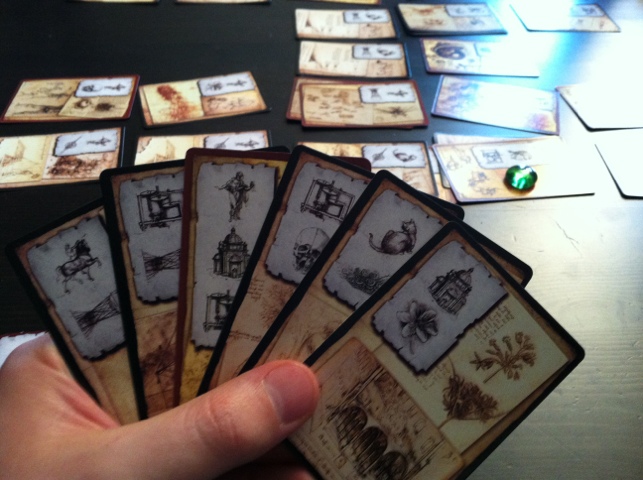 For å glede Marog hadde Takras på forhånd lagt klart Enigma of Leonardo: Quintis Fontis. Marogs første møte med Enigmaet var helt grusom for ham, og han ga det 1 i rating på Geeken. Så med denne nyvinningen av samme spill, var han meeeeget skeptisk. Denne gangen har vi ikke et kryss foran hver spiller. Nå er det et rutenett på 5×5 som styrer mønstrene. Rutenettet bygges fra start, og etter hvert så har vi en firkant. En kort kan legges ned og erstatte et annet, eller legges oppå. Når man har 3 like symboler etter hverandre, får man nøkkelen. Har man allerede den nøkkelen, så må man ha 4 symboler neste gang. Men det er en hake ved det. Du kan ikke spille et kort som har minst ett av symbolene på kortet som ble spilt før deg. Og i tillegg kan det legges ned en veto-stein på et annet kort som gjør det enda vanskeligere å legge ned kort. Så det er en del taktiske valg her. Marog vant med to nøkler mer enn Takras, som igjen hadde en nøkkel mer enn Anne-Marije. Vinneren er den som først får 7 nøkler.