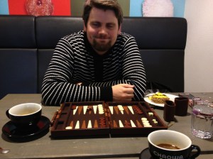 Endelig en kveld uten raiding. Det betyr at Marog er ledig for spilling (av brettspill) og at det er lagt opp til en koselig kveld. En liten forrett med Backgammon og god kaffe satte stemningen for Takras og Anne-Marije. Backgammon er et spill for to, og er derfor ikke spilt i PG tidligere, fordi det finnes så mye annet godt der ute. Men på kafé så er dette et ypperlig spill. Takras forklarte reglene, og terningen for gambling/poeng ble pent lagt til side. Det er litt vanskelig å kunne se løsninger som førstegangsspiller, spesielt når brettet «foldes» rundt, når det egentlig kunne vært helt langt. Men det som er ekstra spennende, er når det nærmer seg sluttspillet. Anne-Marije syns det var ille å få sin brikke helt tilbake til Takras sitt område da Takras begynte å få inn sine. Men plutselig åpnet det seg da Takras ble tvunget til å la en brikke være alene. Denne ble straks fanget av Anne-Marije, og nå begynte det virkelige spillet. Hvem klarte å legge seg best, og ville terningene være lagspiller eller ei? Enden på visa var at selv om Takras hadde en fin ledelse med å få ut sine brikker, så lå han to – kanskje ett – terningkast bak Anne-Marije på slutten. Meget nært.