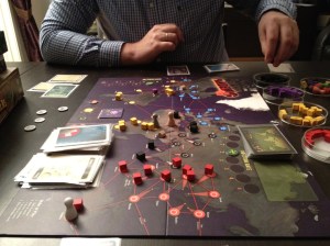 Pandemic! Et samarbeidsspill i PG? Fysjom! Men med de rette spillerne er dette et kjempeflott spill. Og i kveld var det de rette som var tilstede. Med utvidelsen i hånd, så la vi til virus-kort i tillegg til de vanlige spredningene. Marog kunne gi kort uansett hvilken by vi var i. Anne-Marije kunne automatisk kurere sykdommer, og Takras hadde en ekstra handling hver runde. Begynnelsen var greit, og Takras fant en kur for den blå sykdommen nesten med en gang. Trussel avverget, og fort kurert fra hele kloden. Senere var det ganske greit, og den røde sykdommen var det Anne-Marije som holdt i sjakk helt til Takras fant en kur også for den. Takras endret rolle til Medic, og kunne fjerne kuber fra kjente kurer gratis. Da stod Asia for tur, og Anne-Marije kunne fokusere på å kurere den gule. Alt gikk greit, og Marog fant en kur for den sorte før Anne-Marije fant for den gule. Anne-Marije tok en runde og kurerte hele Afrika på én tur. Men plutselig kom viruset for fullt. Hele Sør-Amerika og deler av Nord var full av utbrudd! Det var på nære nippet, og alle fokuserte sterkt på at Takras skulle finne kur for det siste og slemme viruset. Bare én til spredning og det var over og ut. Takras klarte det, og det neste kortet hadde vært døden.