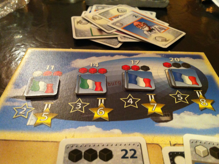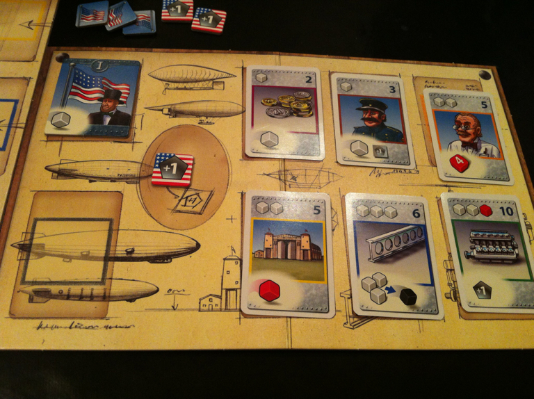Metallurgen gikk hjem og de andre var ahead of the states så derfor dro vi opp i lufta og spilte Airships eller Giganten der Lufte som det heter på tysk. Her starter alle med en hvit terning hver, så skal en kaste terningen som oppfyller nye kort som igjen gir deg flere hvite terninger. Hvite terninger kan gi røde og svarte terninger som gir høyere score som igjen kan gi deg gode seierspoeng. Altså et terningbyggespill. Alt fløt veldig bra til plutselig ingen ville profitere på å ta inn nye kort da de var ubrukelige. Funkenschlag ble nevnt uten sammenligning forøvrig, men noen måtte ofre seg for spillet og få det videre uten å nevne navn(hmm..). Så fikk spillet flyten igjen og Kaoleena tok det siste kortet i en av de 4 poengbunkene som åpnet for de siste 4 luftskipene. Sveinmain tok det minste, Karoleena fant i regelboka på tysk/nederlandsk at de kunne tas i valgfri rekkefølge og tok selvsagt den største, og den nest største. Takras prøvde å få med Sveinmain på et komplott mot Kaoleena så ikke topp-luftskipene gav full pott, men ble øyeblikkelig dolket i ryggen av Sveinmain da han avsluttet spillet med det 4. og siste luftskipet på toppen.