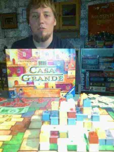 Vegard hadde ankommet og dermed var det klart for Sveinmains nyvinning Casa Grande. I Casa Grande flytter en seg rundet et brett hvor en må sette ut en byggekloss hver gang en flytter seg. En kan også bygge en plattform etter spesielle regler og score poeng for denne. Poeng= Størrelsen på plattformen x etasje den bygges. Ekstraflytt kan opparbeides ved at andre bygger på dine plattformer, men får du 9 eller mer får du istedet 9 penger og står uten mulighet til å flytte annet enn det terningen viser i neste trekk. Det ble mye lav og tett bygging i dette spillet men etterhvert løftet Casaen seg fra bakken og det ble også mer taktisk bygging. Spillet utartet seg slik: Kast terning – flytt – ta noen ekstraflytt alt ettersom – plasser byggestein og evt. bygg plattform. Ikke de store taktiske utfordringene altså, men etterhvert ble det en del ødelegging for hverandre og en del taktisk klosseplassering for å hindre motspilleren å få poeng, eller rett og slett bygge over motspillerens byggekloss – meget effektivt! Ant lå an til 5×5 poeng i 5. etg på slutten, men Sveinmain og Vegard forhindret elegant dette før det ble telling. Vegard hadde vært den desidert beste byggeren med hele 89 poeng. Ant hadde 80, Sveinmain 70 mens Pift endte på 44.