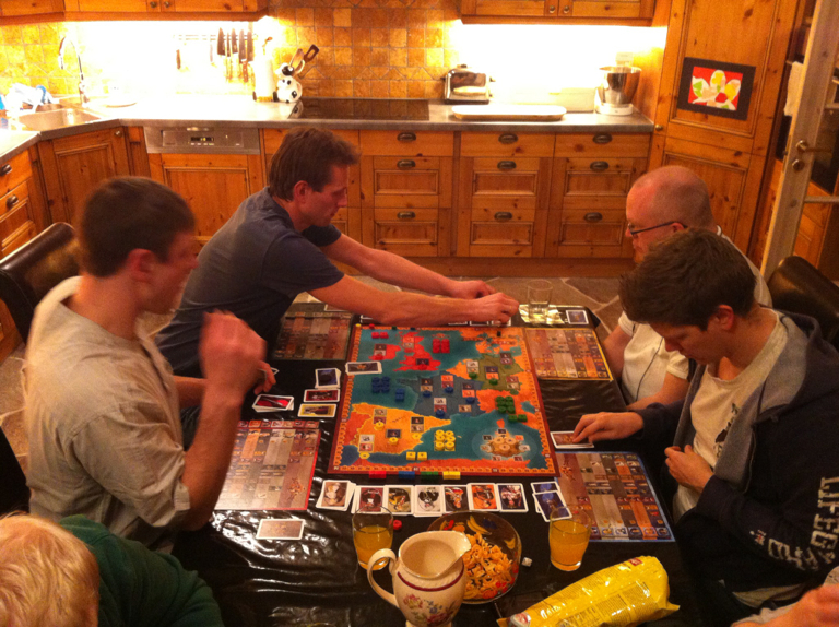 Som en avslutter tok vi en tur til Solkongens slott og Louis XIV. Her gjelder det å inynde seg med hoffet til Solkongen for å få mest mulig innflytelse i form av skjold som gir 1 poeng og oppdragskort som gir 5 poeng pr. kort. Eneste aberet med Louis er et reglene er litt krøkkete og ingen husker alle fra gang til gang, så litt tid tar det før det hele sitter. Det fikk Sveinmain erfare da han gikk for privilegier men da han kikket på kortene sine så var det helt andre han hadde behov for. Men han ble reddet av gong-gongen, og fikk inn noen oppdrag likevel i 1. av i alt 4 runde spillet består av. Det er hele veien en kamp om innflytelsen hos hoffet, hvor en plasserer ut brikker på 12 ulike geistlige, men som regel kun premie til den første, derfor mye interraksjon i dette spillet. Black ant tok en Sveinmain spesial og fortalte alle at han var svak og at Vegard heller måtte ødelegge for de andre. Trikset virker fortsatt og Black ant som dog hadde fått en litt svak start var plutselig i tet! Pift som ikke hadde spilt spillet før hang godt med til førstereisgutt å være og før siste runde var det hele meget jevnt. Ant fikk mest innflytelse hos hoffet til Louis XIV i siste runde og vant med 48 poeng foran Vegard på 43, Sveinmain på 38 og Pift på 28.