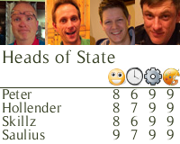 Hollender hadde forberedt Heads of States. Halve bordet ble dekket med det store brettet, og sammen med Peter, Saulius og Skillz satte de opp brikkene, sorterte adelsmenn og prøvde å få oversikt over det hele. Hollender forklarte reglene og alle muligheter man får til å score poeng. I prinsippet er det majoritetsspill hvor spillere setter ut sine adelsmenn i senmiddelalderen-Europa. Disse adelsmenn kan score initielle poeng og gi poeng når en epoke er omme. Underveis kan man også få poeng for å ha adelsmenn i alle regioner i ett land, og få poeng når man har adelsmenn i alle 7 klasser. Man skal samle kort for de rette adelsmenn-kombinasjoner. Hollender satte raskt ut to baroner i Frankrike, slik at spillet var i gang. Frankrike gir mest seierspoeng for majoriteten, men også minst for den andre plassen der. 1589 var et rolig år. Alle satte ut sine adelsmenn, fikk poeng og det ble ikke store forskjeller. Men med færre ledige plasser på brettet, ble det tid for å drepe noen.
