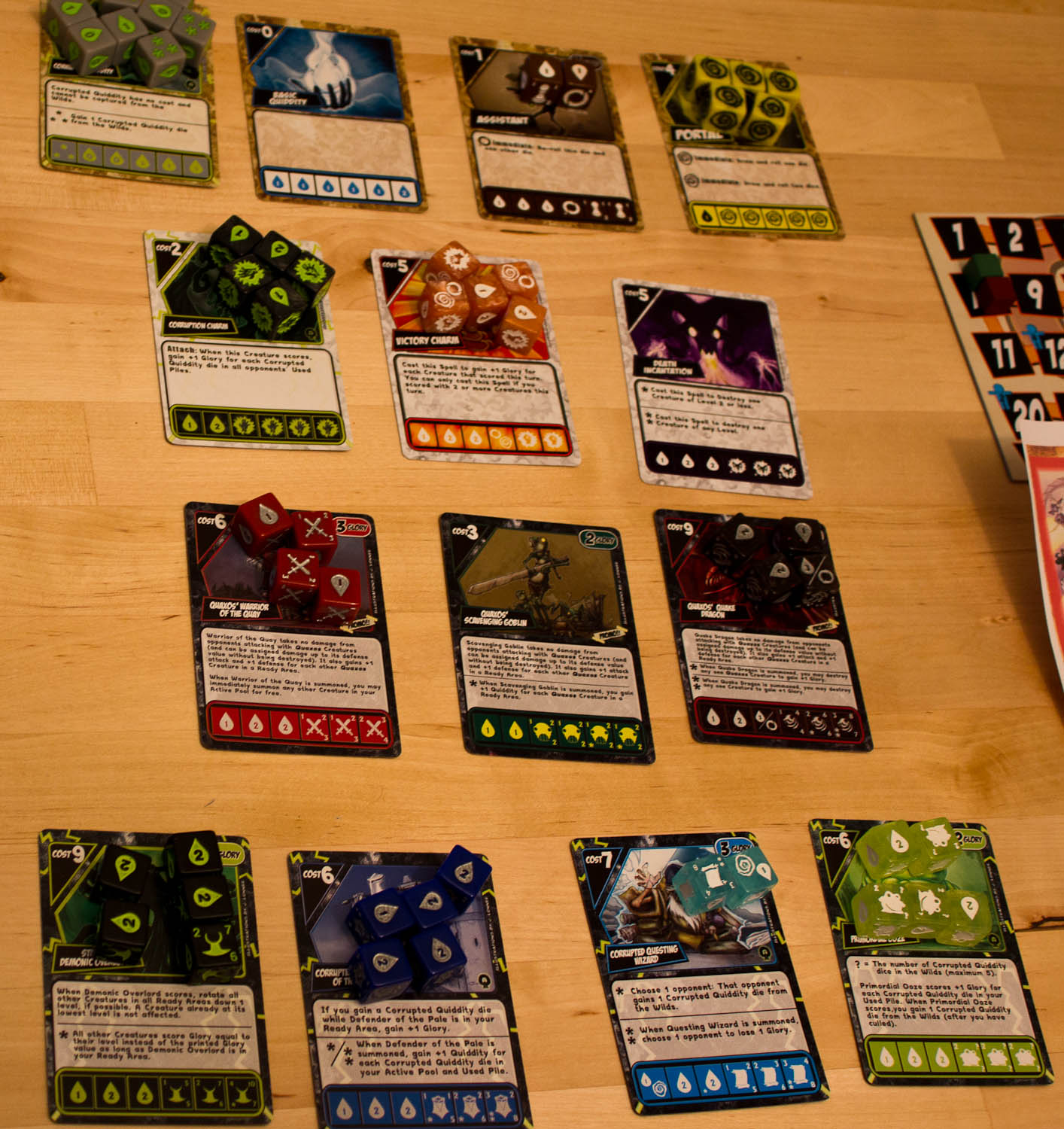 Neste ute var Quarriors, et terningsspill med mye variasjon. Dette har vist seg tidligere å være bra med 2 spillere men litt saktegående med 4. Men 2 spillere igjen og det var like kjapt. Mye enklere å ta i bruk de monstrene som tas inn, og mulighet for å legge en slags strategi. Først ute var det blanding av promokortene Quaxos sammen med 4 kort fra utvidelsen. Korrupsjonsterningene ble trukket inn men hadde aldri noen innvirkning på spillet. Takras sikret seg en drage, deretter en til og så en tredje. Men Skillz hadde også noen gode monstre på lur, og det ble meget jevnt. Han klarte akkurat å nå 18 poeng da Takras gikk forbi 20-tallet. Revansj!