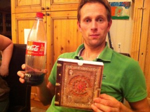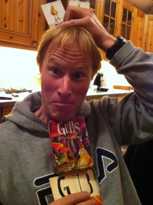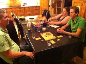 7 minutter igjen til Kim måtte forlate oss, og hva rekker vi da? Bluff selvsagt. En skikkelig runde lyn-Bluff. Takras kjørte som vanlig høy risiko og var førstemann ut. Det ble tynnere og tynnere med terningen i koppene til Kim og Sveinmain mens Peter hadde sine 4. Kim røyk så og var på vei ut døra da Peter satte budet på 4 ere. Sveinmain hadde stjerne og høynet til tre 4 ere. Peter åpnet koppen sin uten en eneste 4er, med et bredt smil, og rå latter. Bluff er og blir Bluff – et herlig spill!!!