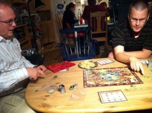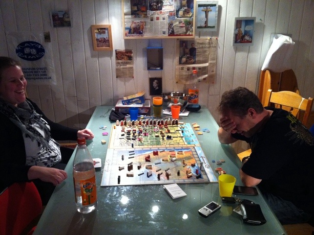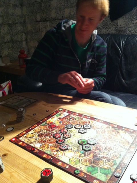 Det er så mye å holde styr på at Hollender og Takras gjorde Kaoleena helt sprø med de samme spørsmålene om igjen og om igjen gjennom hele spillets gang. AHA! hører man ofte, etter hvert som guttene ved bordet skjønte en regel her og der. Hollender hadde en virkelig god poengmaskin, men innså etter hvert at han var for tidlig ute med å kjøre bonusbrikkene sine. Kaoleena skaffet seg fra starten av mulighet til å få 4 arbeidere etter hver runde, en meget god egenskap. Takras hadde flott plassering av sauene sine og sanket inn poeng her, men lite på andre områder. Hvem som ledet og når er det helt umulig å huske, for det varierte sterkt. Hollender seilte akterut den siste runden, og ble innhentet og overtatt av både Takras og Kaoleena. Kaoleena vant, selvsagt, noe som sier at det kan være et spill man kan bli flink i? Men kjennskap til egentlig greie regler er en stor fordel. Noe Takras og Hollender hadde større vansker med enn nødvendig.