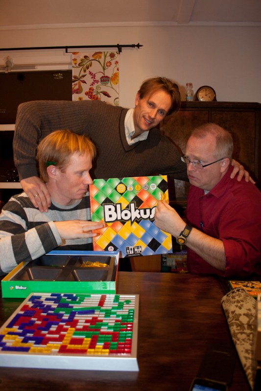 Blokus lå å fristet i skapet, og Takras som hadde øvd på Blokus på iPhonen sin i det siste var meget klar for en runde. Ville brettutgaven være like enkel som iPhone-utgaven. Som vanlig var det 1. mann til midten, så begynte mange stygge sperringer. Som vanlig la Peter sin elsk på Sveinmain, mens Hollender og Takras kjempet noen harde slag. Noen trygge områder ble linket opp mot resten av brettet før de som hadde kontrollen på området prøvde å gjøre det de kunne for å ødelegge. Det ble en meget jevn batalje som Hollender til slutt klart å ta hjem seieren i. Vi andre delte broderlig 2. plassen.
