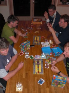 Oss andre, Saulus, Vegard, Black ant og Sveinmain som denne gangen hadde finlest reglene ville ta alle med på cruice på 4 verdenshav. En kortstokk full av båter som kunne gå ulike strekninger ble stokket og penger delt ut. Hver runde gjald det å skaffe seg båter som kunne gå strekninger en ønsket, og ikke minst hadde flest mulige poeng på seg. Av fire kort kunne en velge ett gratis, men ønsket en et av de andre så måtte en betale penger, og penger er mangelvare i spillet. Etterhvert som cruicene ble gjennomført scoret en poeng ut i fra en finurlig skala. Det gjaldt selvsagt å ha de beste cruicene, da alle skulle seile 4 like cruice og konkurrerte selvsagt mot hverandre. Spillet inneholdt en mors0m kort-limitvariant hvor en kun hadde lov å ha 2 ekstra kort enn det cruicet en skulle «bygge». Hadde en fler måtte en «bygge» uansett. Dette skaffet spillet et taktisk element som gav visse utfordringer. Black ant såpass at han halvveis prøvde å gjøre om på reglene uten å lykkes nevneverdig med det. Saulus satset på post-skip som fungerte som jokere, mens vi andre satset på kløkt og selvsagt en porson flaks. I dette spillet lønte det nok seg mest med kløkt og flaks og etter litt fintelling på vant Vegard komfortabelt! 1. Vegard 54 2. Sveinmain 51 3. Black ant 40 4. Saulus 19