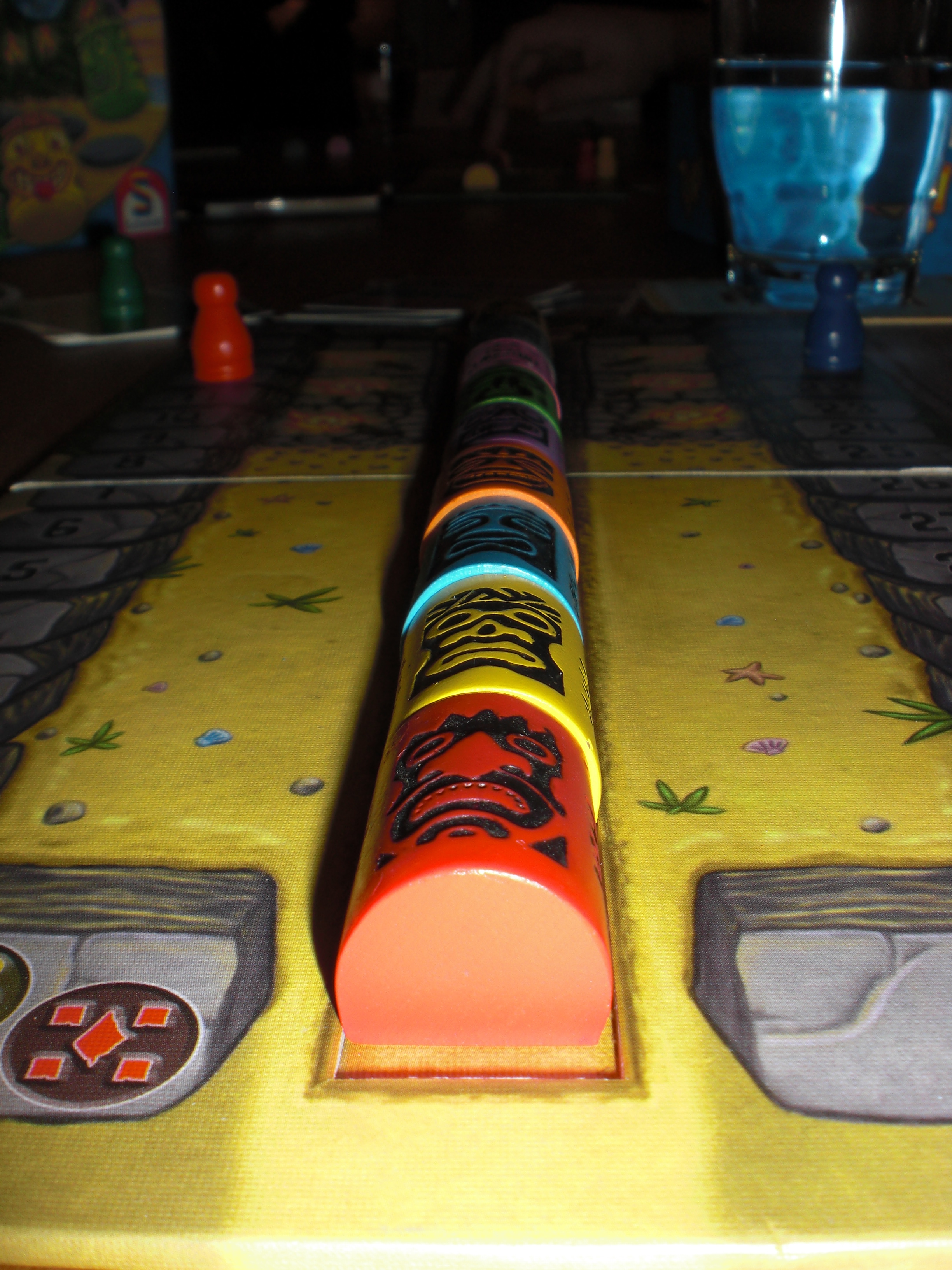Hollender hadde for 2. uke på rad invitert til midtukespilling. Vet ikke om det var sjakken på mandag som gjorde utslaget, men hele 6 spillere hadde møtt opp klare til dyst noe som til midtuke å være er ny rekord. Innledningsvis delte vi oss i to, og spilte det samme spillet: Tiki Topple. Et utrolig kjekt tautrekkingsspill hvor det gjelder å få sine farger på toppen av totemlen, uten at de andre svir brikkene du satser på av eller noe.