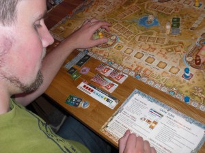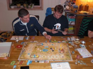 er og en har fått kunder i begge ender er det telling. Antall handlinger varierer fra 2 til 4 og både Innante og Kjell Bjørn kom kjapt inn i det, så det var bare å gi jernet. Kjell Bjørn kjørte noen egne strategier og bygde i et område med fattige kunder, men likevel etter å ha spilt ut klokke-brikken som konsoliderer området så kunne han innkassere hele 44 poeng. Innante og Sveinmain trodde løpet var kjørt, men de klarte å kjempe seg inn på slutten. Sveinmain og Innante gikk stort sett samme vei, og det gjorde at Sveinmain fikk servitør-rollen og Innante kunne score billige poeng etterpå. Dermed stakk Innante av med seieren igjen. 1. Innante 138 2. Sveinmain 116 3. Kjell Bjørn 111.