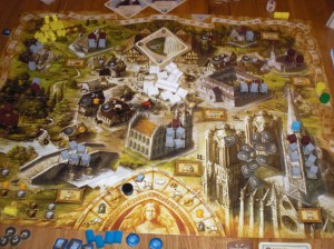 2 flotte spill entret bordet, noen av de vakreste i brettspilluniverset, nemlig World without end og Colosseum. Sveinmain, Bjørn og Hollender hev seg over World without end. Hollender forklarte reglene så godt han kunne. Mye innfløkt i dette relativ enkle spillet, men mye å ta hensyn til. 6 hendelser over 4 runder rundt det harde livet i Kingsbridge, og etter hver runde skulle en ha nok korn, penger og ………. til å gi til kirken. En måtte dermed samle på det en måtte samtidig som en måtte prøve å skaffe byggeklosser og tjene poeng utenom. Mange morsomme for oss nye mekanikker i dette spillet. Likte spesielt godt kortet som settes i 4 retninger, og den som sitter i den retningen kortet peker får det som er vist på kortet. Den som har serven velger selvsagt hva han skal få. I tillegg til en evt. ekstrascore på en annen skala. Vanskelig og beskrive, men absolutt nyskapende og en meget spennende mekanikk. I tillegg gjorde hendelsene at den langsiktige tankegangen av og til ble satt ut av spill.