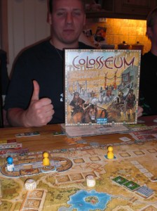 Det var et jevnt løp helt til mål, hvor Vegard vant etter å ha fått et godt terningkast som gjorde 14 avgjørende poeng mellom ham og Takras. Sven og Takras kom likt bak, men Takras vant med god margin da pengene skulle telles opp. Colosseum er et flott og herlig spill, men tre spillere er kanskje i det færreste laget.