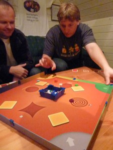 Til slutt ble det noen runder med kortspillet Super Circles. Dette ligretto-aktige spillet fra Vennerød Forlag er nok det beste spillet man kan spille i PG Grotten om vinteren. I løpet av 20 minutter satt fire spillere med svettet på pannen! Intensitet, høyt tempo og raske reaksjoner er ingredienser i dette hysterisk morsomme kortspillet. Reglene er enkle: kvitte seg med egne kort så fprt som mulig. Kortene har fire sirkler og fire tall. Tall og farge skal matche med det aktuelle kortet på bordet. Peter (som kveldens eldste) var skeptisk, men ble svært overrasket med en seier i den første runden. André var raskest i runde nummer 2. Da fikk Peter etter eget utsagn paralyse-analyse. Ellers med andre ord: tenketid betyr motorstopp. André vant også runde nummer 3, mens Peter kom sterkt tilbake i den siste runden. Kort og meget kjapt, men også morsomt og hysterisk! En ideel oppvarmer for gamers i kalde spilllokaler, eller en must for ligretto-fans.