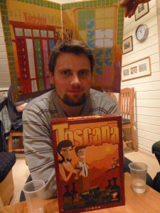 bestikke de i vinrådet, selge og kjøpe vin og sette ut sine arbeidere på vinmarkene, og det var nettopp disse arbeiderne som til slutt skulle bikke spillet overende denne gangen. Alt så lenge vel og bra ut. Alle dyrket sin åkrelapp, og solgte dyrt og kjøpte billig. Reglene satt og spillet levde, men etter at vinmesterene begynte å entre bordet oppdaget vi at det ikke var mere plasser igjen på vingårdene, selv de ut-tørkede markene. Alle hadde et par vinmestere igjen og stilte spørsmål. Etter en fn febrilsk leting i regelboken oppdaget regelforklarer Sveinmain at det visst gikk an å sette ut flere arbeidere på samme åkerlapp. Noen kreative forsøk på å redde spillet ble foreslått, men det hele endte med at vi avsluttet der og da og André ble utropt som symbolsk vinner. Vi alle hadde fått en smak av Toscana, og ble imponert over lettspillheten, variasjonen mellom kort og lang strategi, så neste gang, med eller uten vin så må vi nok smake litt på Toscana en gang til.