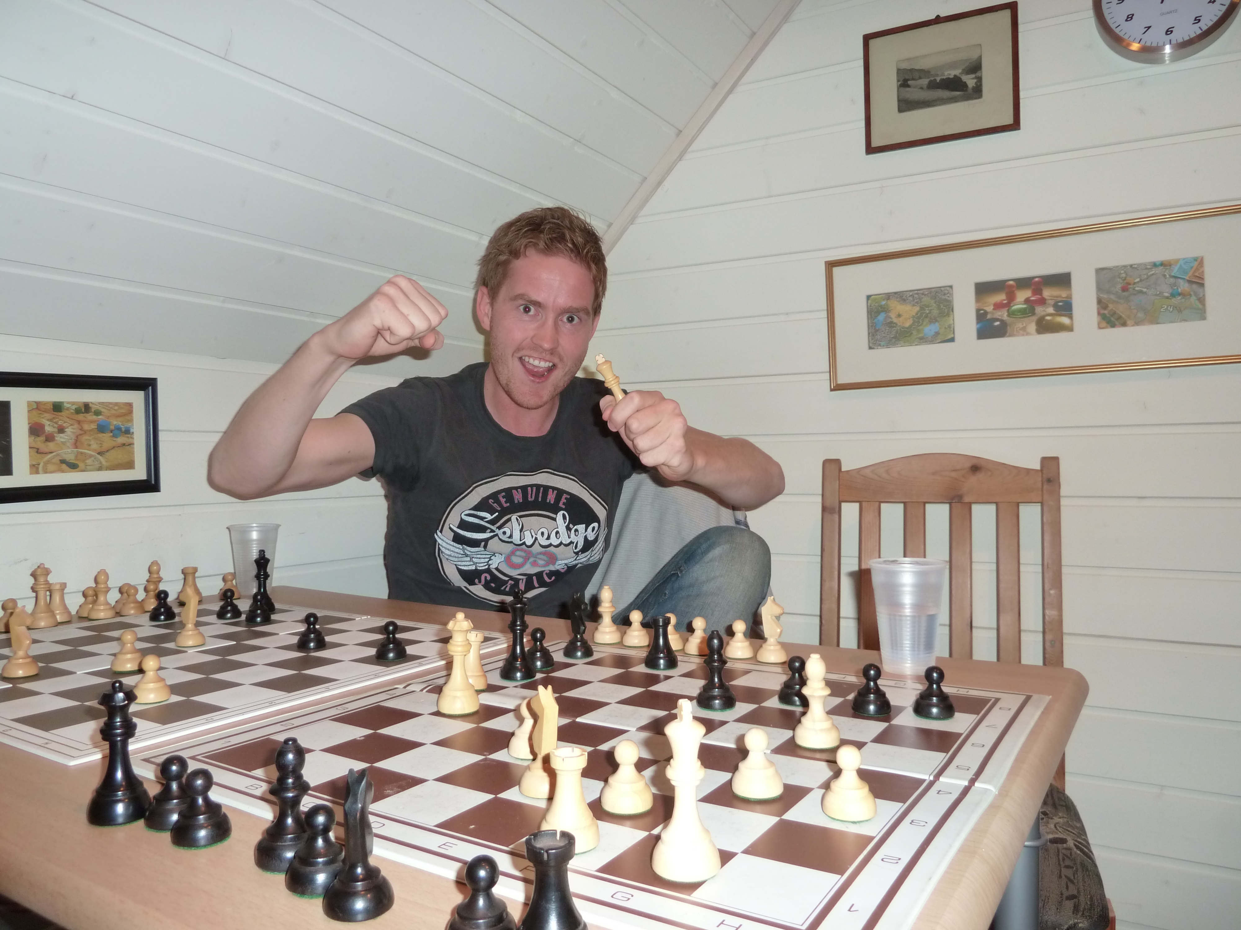 7 brettspill på en gang på spill-loftet var og blir nok historisk, men alle gikk på med godt mot, og Rudi sprang rundt og fra brett til brett og flyttet brikker. Vegard var første mann ut, og Sveinmain var siste mann inn og tok over hans brett. Rudi merket større motstand fra enkelte i PG enn han hadde forventet, og spesielt 3 stk satt igjen som han slet med å klare. Peter från Kalmar, Dr.Proktor, tidligere Østfoldmester i sjakk, og Saulus fra Litauen som hadde vokst opp med sjakk til frokost, middag og