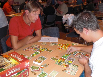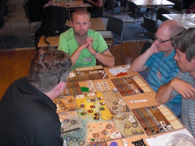 Med 7 spillere var det på tid og dele seg i 2 bord. Sveinmain forelso Pompeji på det ene bordet, mens Hollender foreslo BigCity på det andre. 4 spilte Pompeji, og en kjapp regelforklaring for André og Innante som ikke hadde prøvd det før så var vi i gang. Alltid litt trøblete oppsett i dette spillet, og denne gangen ble det veldig få kort med i spillet. Mulig dette er riktig utifra orginalreglene, men slik Sveinmain hadde spilt det tidligere ble det heller en tam omgang denne gangen med få brikker på brettet og et kjapt vulkanutbrudd. Men vi fikk smakt på brenning i vulkanen, men må nok toppe spillet med fullsatt by neste gang. 1.Innante 2.Sveinmain 3.Vegard og André 4.