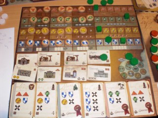 Vakre spill sto på PG menyen også denne torsdagskvelden. Hollender hadde invitert til prøvespilling av Days of Wonders spill Collosseum. Mens Vegard og Hollender ventet på Sveinmain tok de likegodt en runde med Patrizier. Her gjelder det å bygge opp byer i Italia med takbrikker i ymse farger. Hollender hadde øvd på forhånd og da går det ofte slik det bruker å gå. Hollender vant som han ville denne gangen, i dette kjappe duellspillet som gikk unna på en knapp halv time.